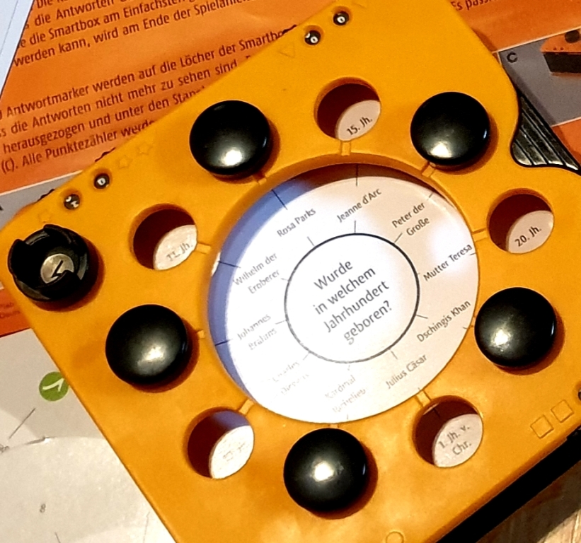 Vor den SpielerInnen liegt ein quadratisches Etwas. Smartbox wird es genannt. Die Box beinhaltet 100 beidseitig bedruckte Quizkarten. Die Karte, die oben aufliegt, möchte beantwortet werden. Natürlich sind die Antworten nicht zu sehen, sondern mit schwarzen Runden Markern abgedeckt. Die lassen sich zum Überprüfen der Antworten dann einfach aus der Box herausziehen.