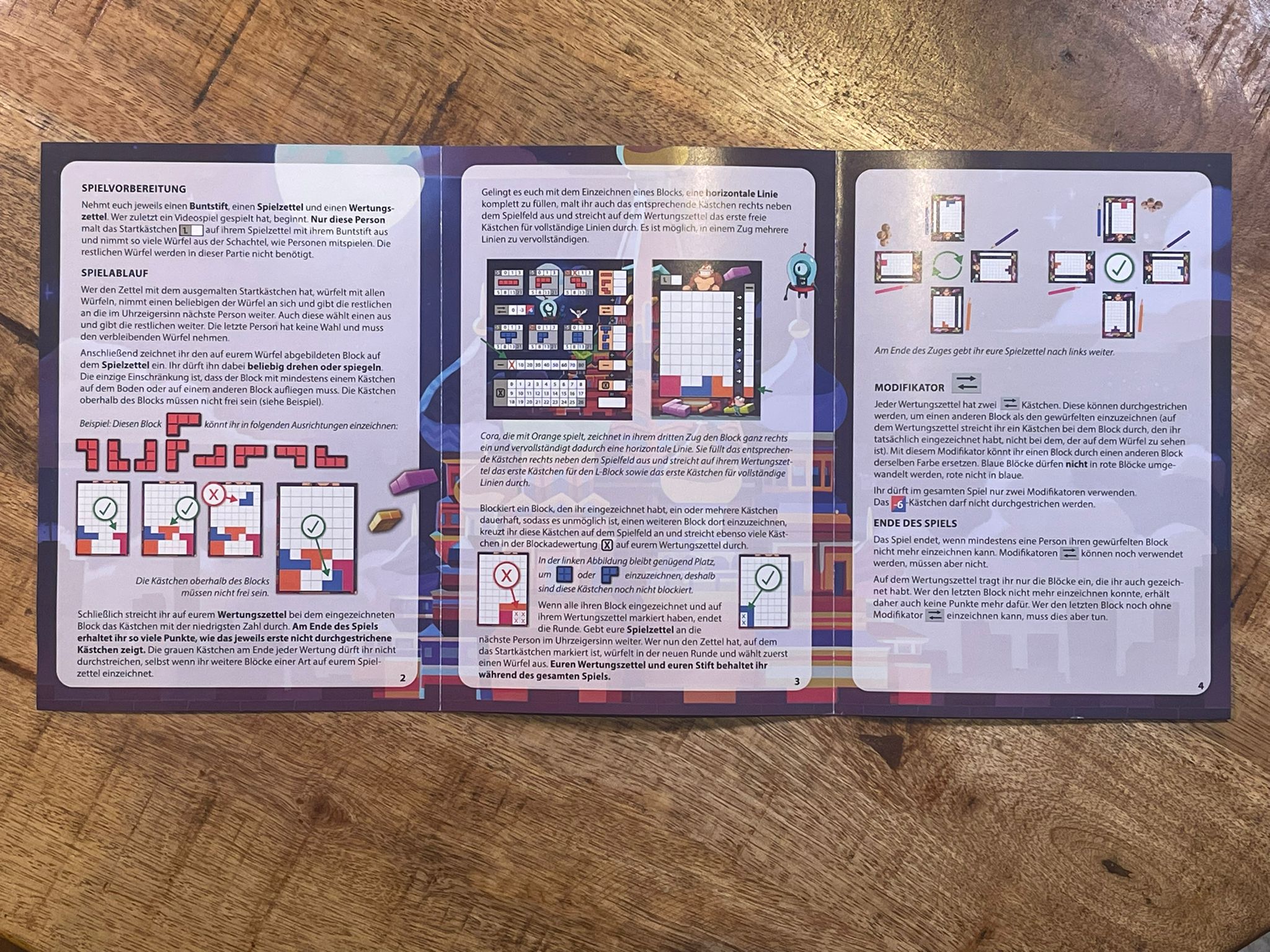 Blockits setzt sich zusammen aus vier Würfeln, einem Spielblock, einem Wertungsblock und vier Buntstiften. Die Blöcke sind dabei beidseitig beschreibbar. Bei den Buntstiften handelt es sich um kleine Buntstifte. Hier könnte bei einer großen Begeisterung für das Spiel, die Stifte nach einiger Zeit zu kurz werden. Gleichzeitig sind die Spielblöcke ausreichend groß, sodass der Spielspaß lange vorhanden sein kann. Zusätzlich zu dem Spielmaterial befindet sich in der Spielbox noch eine leicht verständliche Anleitung, die sich vielen Abbildungen und einigen Beispielen bedient, und damit den Einstieg ins Spiel leicht macht. Das Design von Blockits gibt dabei Verweise auf Videospiele. So zieht sich passenderweise das Design über das Spielmaterial und der Anleitung und sorgt so für ein stimmiges Gesamtbild.
