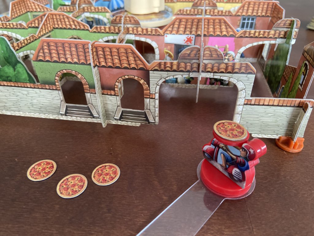 Der Ort wird als 3D Model aufgebaut, mit Pino dem Pizzabäcker als Aufziehfigur in der Mitte. Dieser Aufsatz sorgt dafür, dass alles wackelt wenn er seinen Pizzateig knetet. Das Spiel bietet zwei Varianten: Zu Beginn eine einfache mit der wir das Steuern des Rollers mit wenig Zeitdruck üben können und dann die normale Variante. In der einfachen Variante beliefern wir einen Kunden in jedem Ortsteil wenn wir an der Reihe sind, in der normalen Variante gewinnt wer seine Karten als erstes abgearbeitet hat. Es können mehrere Kunden pro Runde beliefert werden, wenn die Zeit reicht.