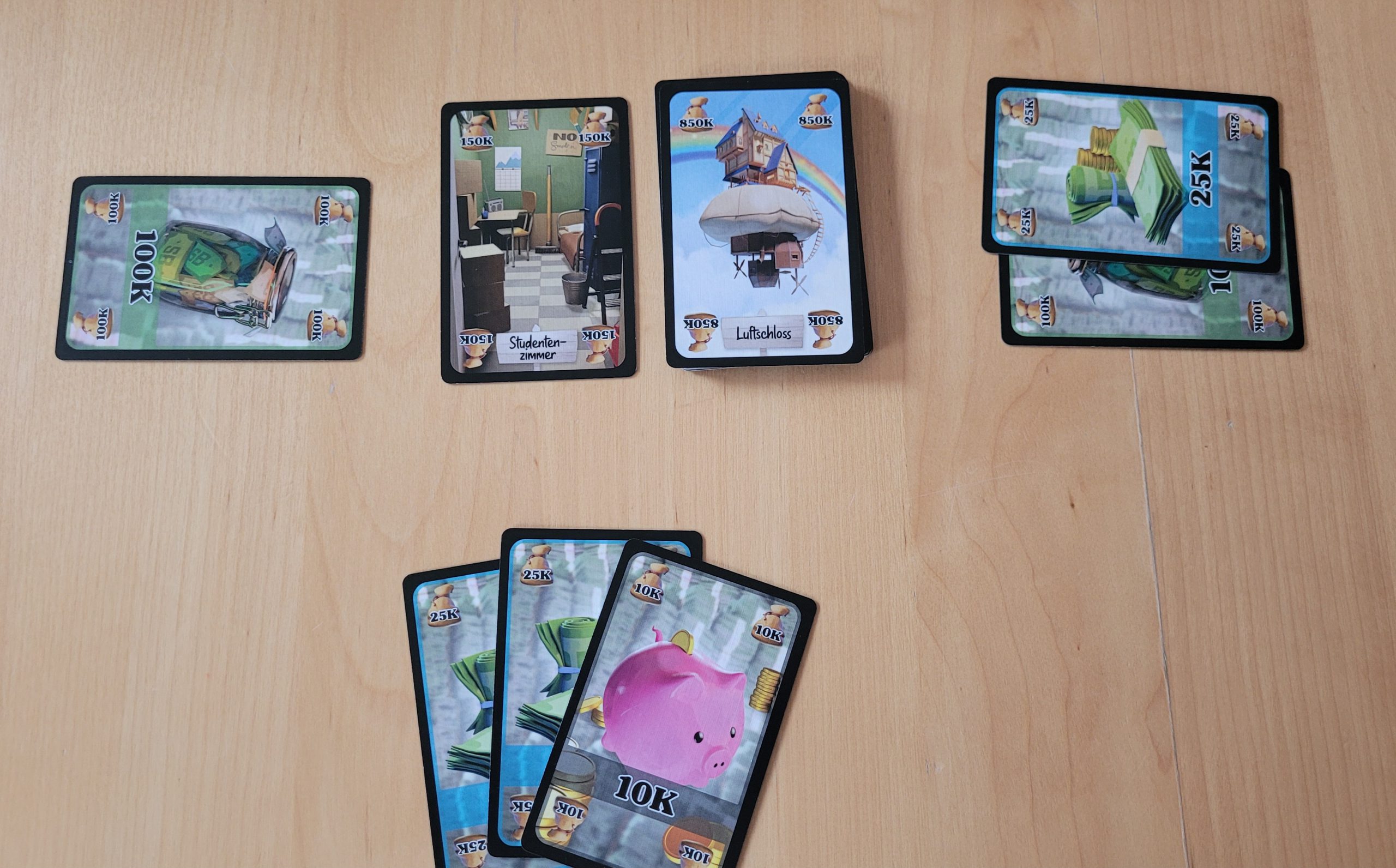 Die erste Person beginnt und macht ein Gebot für die ausgelegte Immobilienkarte. Hier ist fast alles erlaubt, nur darf eine bereits gelegte Geldkarte nicht mehr auf die Hand genommen werden um Beispielsweise den Geldbetrag zu wechseln. Das erweist sich tatsächlich als etwas knifflig, denn werden zu viele niedrige Geldkarten gleich am Anfang gespielt, dann kann es sein, dass zu einem späteren Zeitpunkt keine passenden Geldbeträge mehr auf der Hand sind.