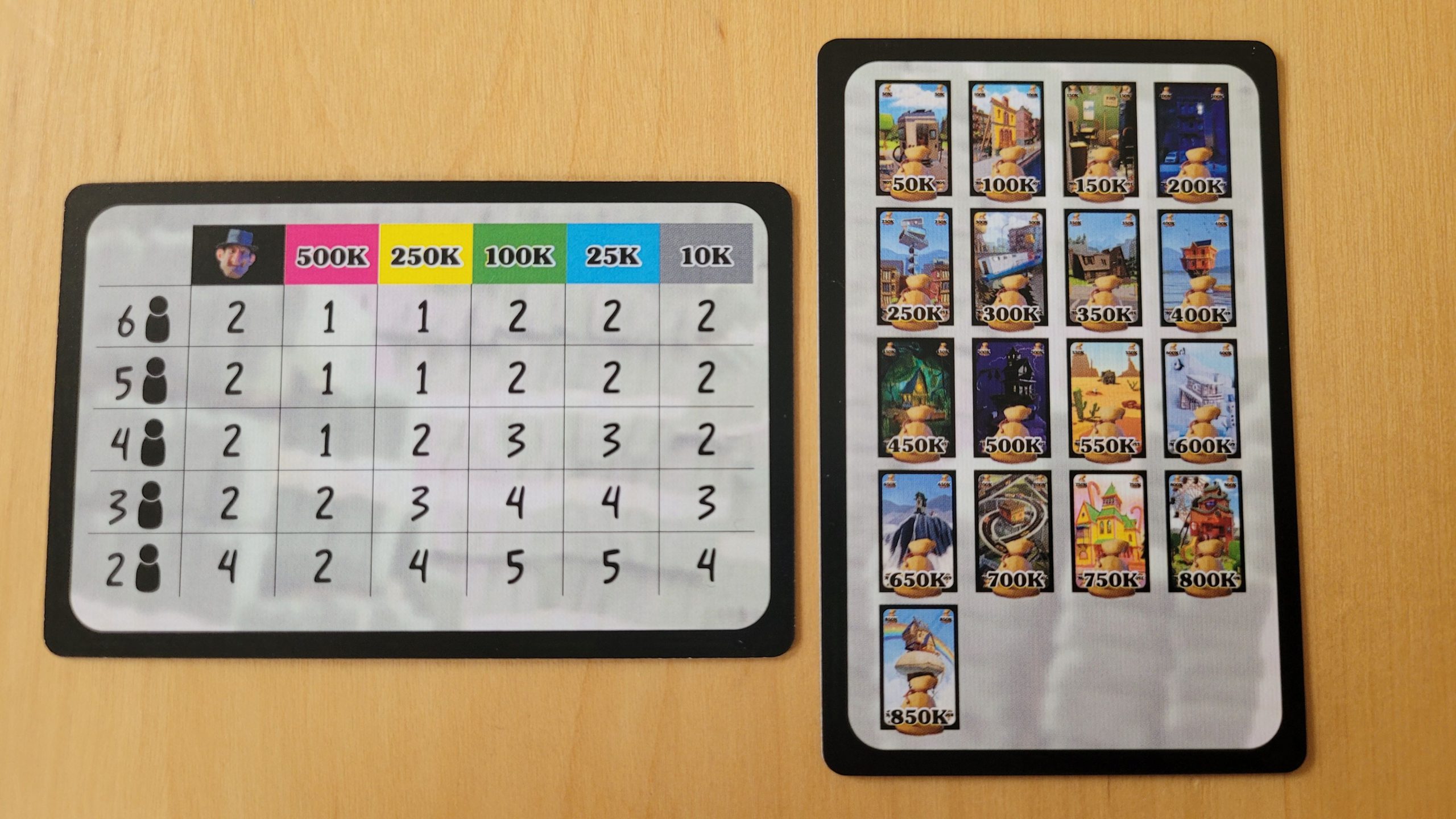 Wir starten alle abhängig davon, wie groß unsere Runde ist, mit einer bestimmten Stückelung an Geldkarten. Für den schnellen Überblick haben wir alle eine Übersichtskarte mit den nötigen Werten. Auf der Rückseite sind auch praktischer Weise alle 17 zu erwerbenden Immobilien inklusive ihrem Wert abgebildet.