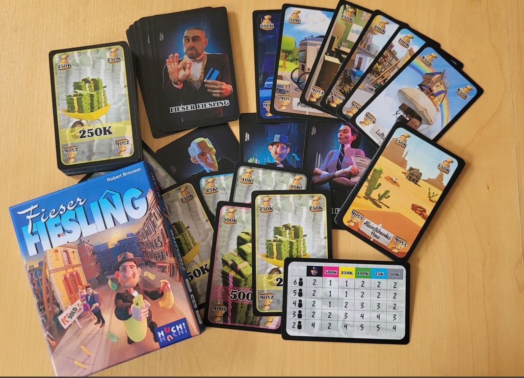 Nach ein paar Runden schrumpft das Geld trotzdem merklich und die Luft wird dünn. Zwischendurch haben wir alle Bedenken, ob wir überhaupt bis zur letzten Hauskarte durchhalten. Bereits ersteigerte Häuser dürfen zum Glück als Geldkarten wieder eingesetzt werden. Da ist es für einen „Fieser Fiesling“ besonders lukrativ den Pott zu erhalten. Übrigens, Geld ist am Ende nichts wert, es zählen für die Punkte nur die Werte der Immobilienkarten. Wer am Ende hier den größten Betrag erreicht, ist Sieger.