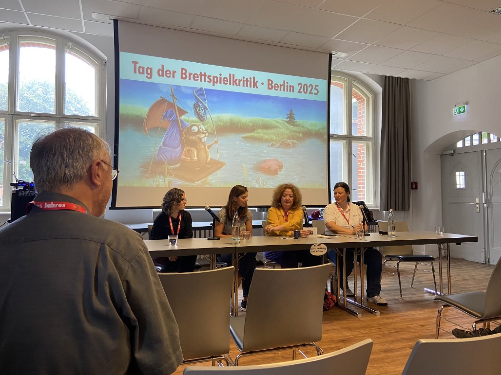 Für uns war die Preisverleihung nur der festliche Höhepunkt eines Wochenendes voller Austausch mit Gleichgesinnten. Der Spiel des Jahres e.V. lud parallel ein, um wieder einmal in fachlicher Runde das Thema Brettspielkritik zu beleuchten. So konnten wir mit vielen anderen Journalist:innen und Spieleschaffenden in Austausch treten. Es ist erstaunlich, wie viel Arbeit eigentlich in dieser Branche steckt. Von Autor:innen geht ein Spiel über Redakteur:innen einen langen Weg, bis es im Spieleregal des Fachhandels stehen kann, um dann von Spielenden und Medienschaffenden ausprobiert und bewertet zu werden. Beispielsweise., hat Wolfgang Warsch erzählt, dass er die Idee zum Spiel Topp die Torte! schon vor 3 Jahren hatte, damals noch mit einem gänzlich anderem Thema. In seiner Version wurden Türme in die Luft gebaut. Diese wurde dann durch die Redaktion des Schmidt Spiele-Verlages verändert, hin zum Tortenschichten.