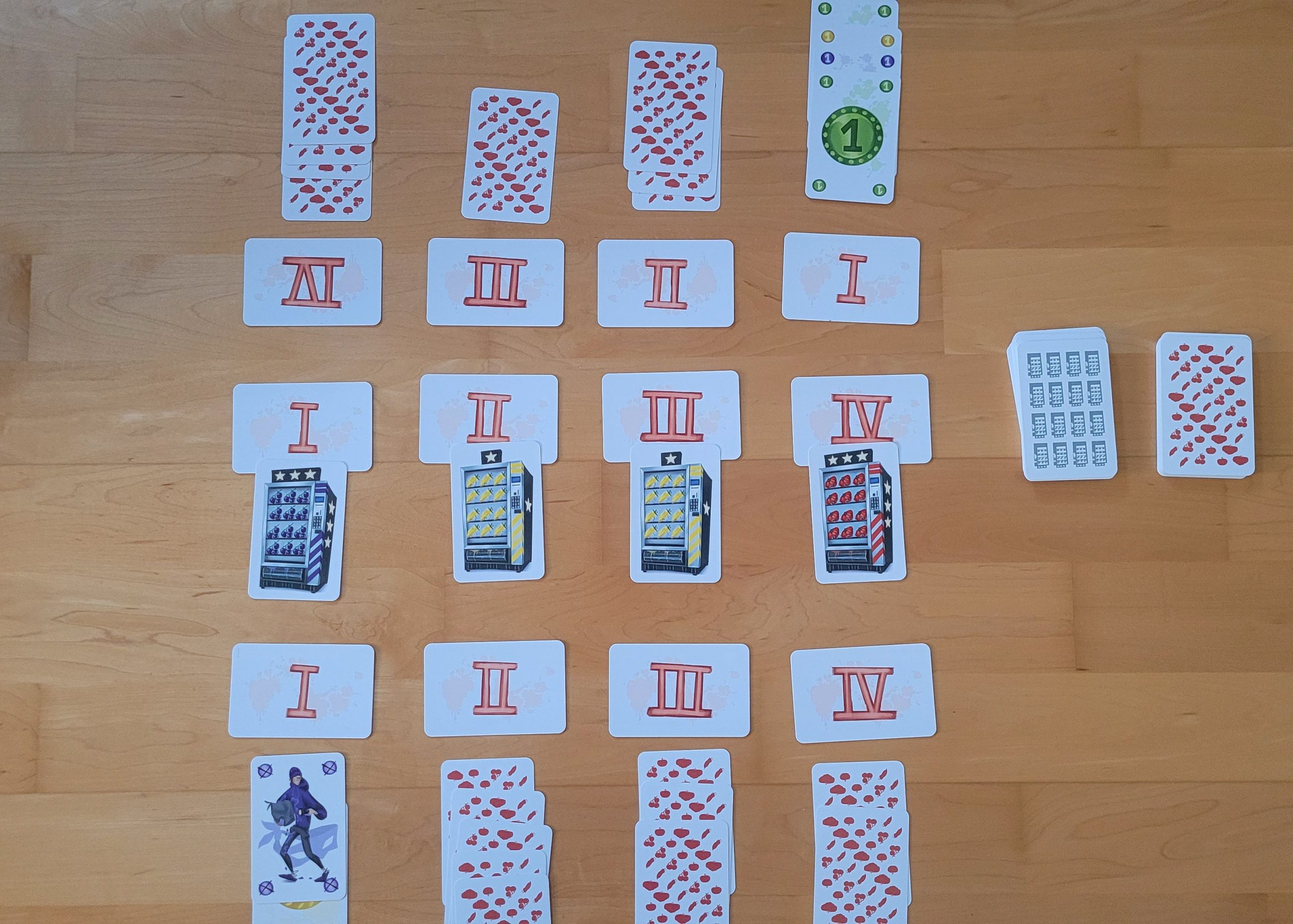 Hierzu bereiten wir unseren Spielaufbau folgendermaßen vor: In jeder der vier Runden legen wir vier Tomatomatkarten aus, jeder von den Automaten erhält eine Ordnungskarte von I – IV. Alle Spielenden erhalten ebenfalls solche Ordnungskarten, die sie vor sich auslegen. Nun werden je zwölf Spielkarten an alle ausgeteilt, diese bilden dann den persönlichen Nachziehstapel.