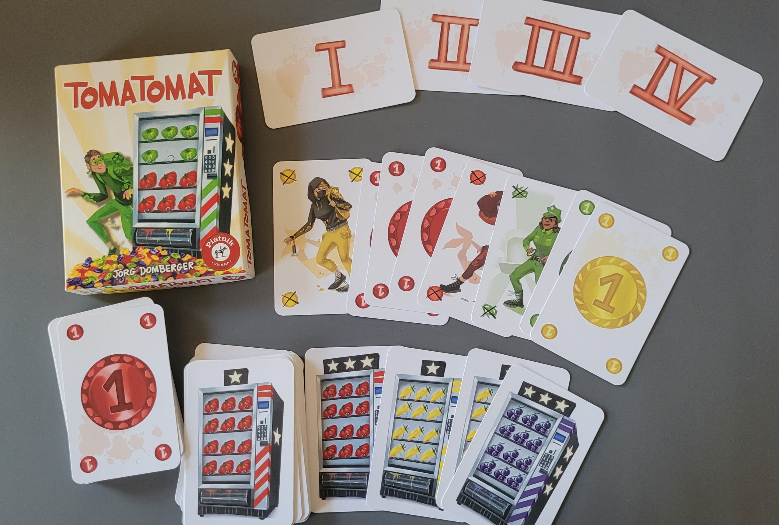 „Tomatomat“ spielen wir recht flott über insgesamt vier Runden. Wir spielen alle gleichzeitig. Unser Ziel ist es unsere Karten taktisch klug so auf die verschiedenen Automaten zu setzten, dass wir bei der Auswertung möglichst viele wertvolle Tomatomaten ergattern.