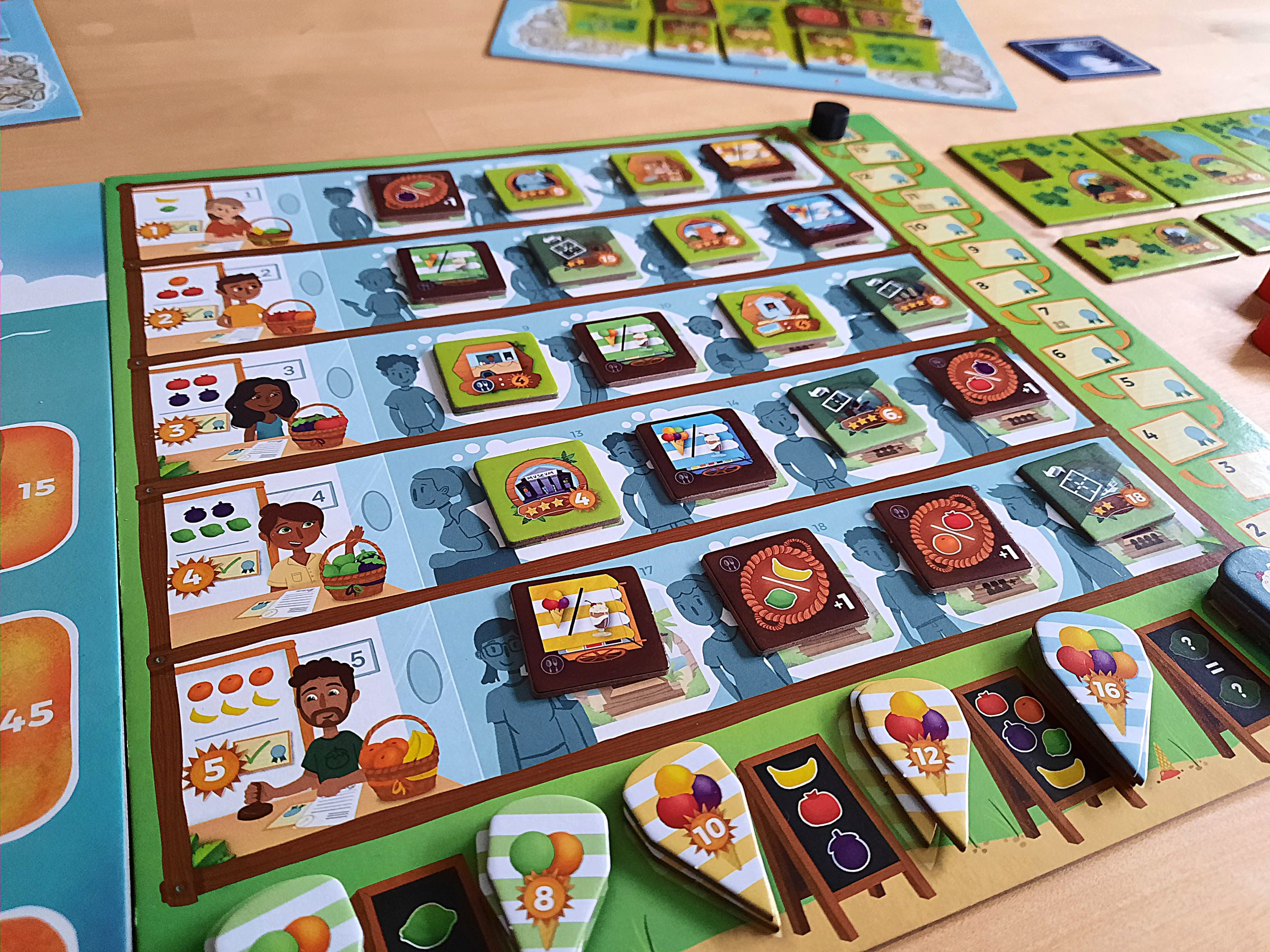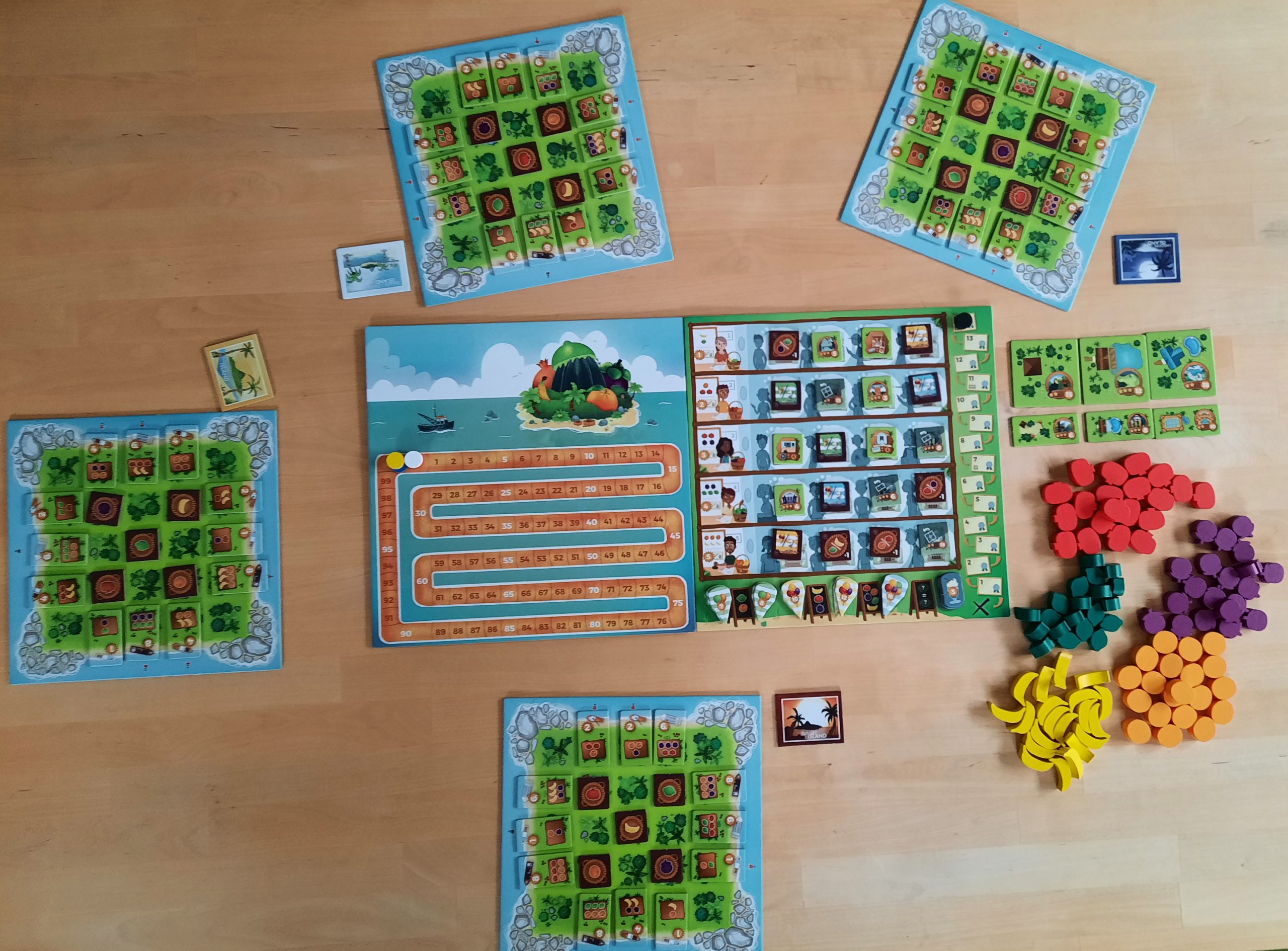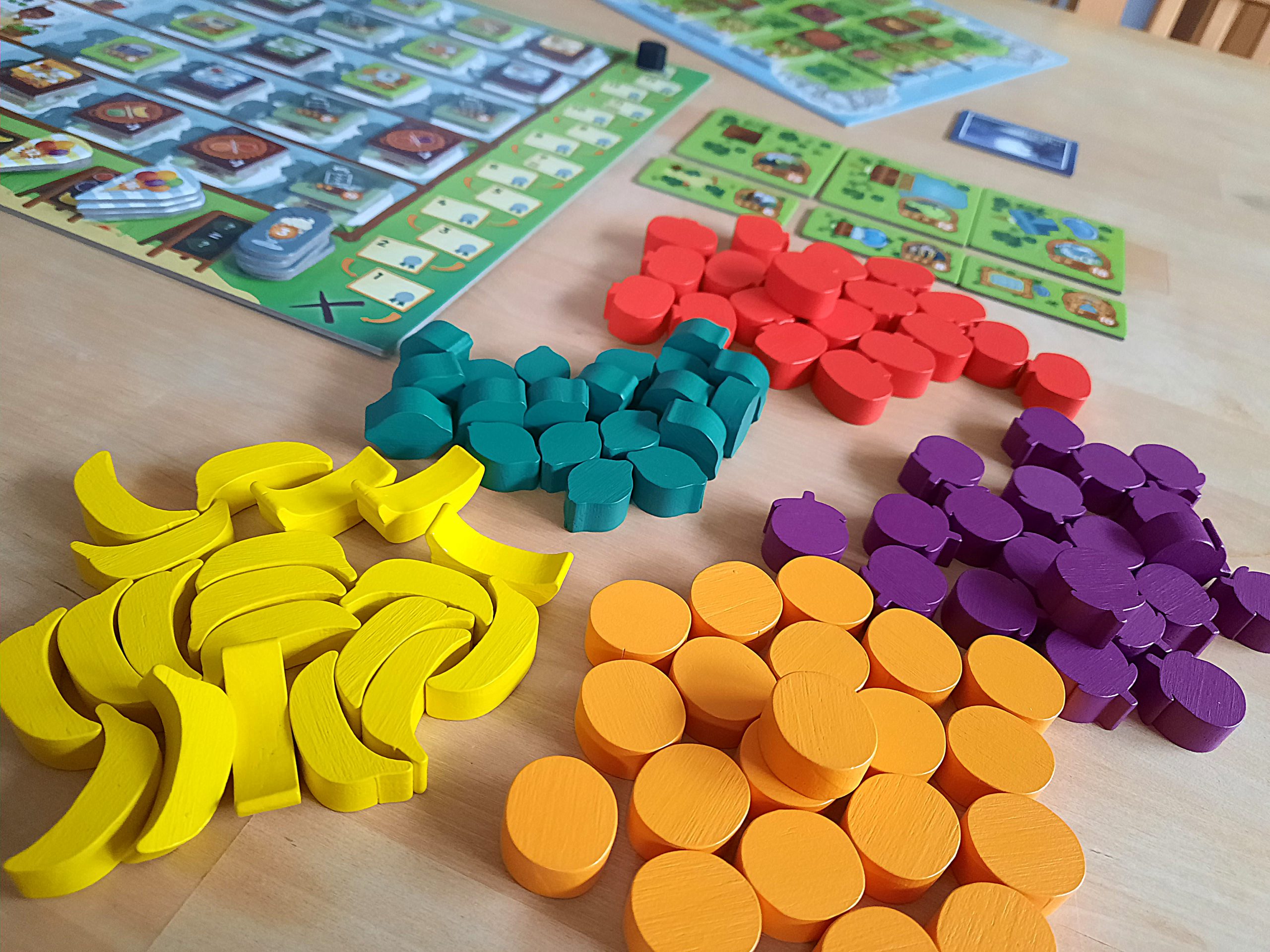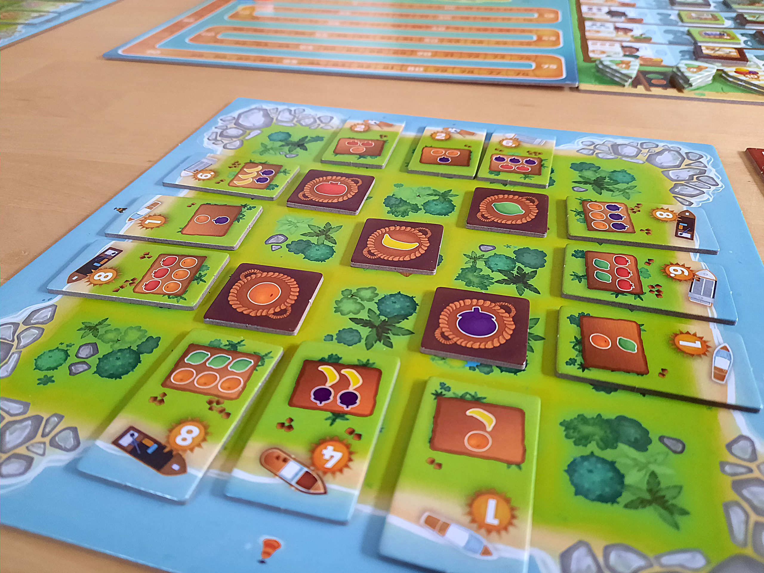 Jede Person hat ein eigenes Tableau vor sich liegen. In der Mitte sind fünf Ertragsplättchen. Die erste Aktion jeder Person ist, eines davon zu bewegen. Man erhält für jedes gezogene Feld eines der abgebildeten Obstteile. Das kann zu Beginn nur eines sein, doch durch die erste Bewegung öffnet sich für ein anderes Plättchen ein Weg über zwei Felder.