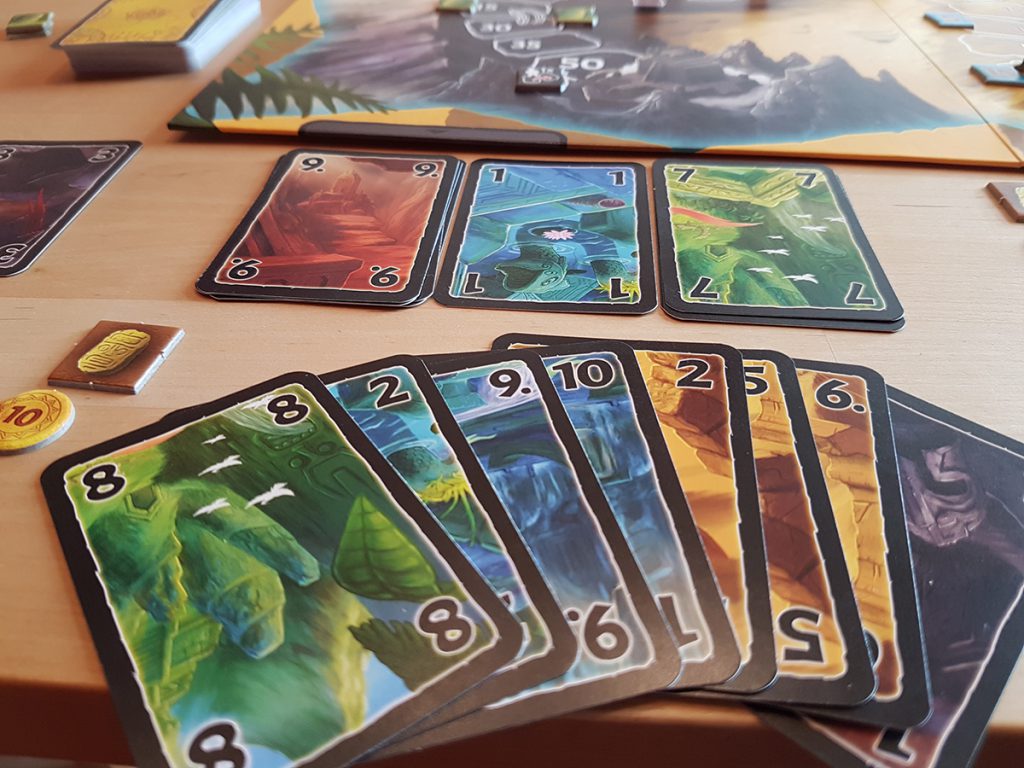 Jetzt ist Lost Cities als Brettspiel erschienen und bietet bis zu vier Spielern die Möglichkeit, fünf Expeditionen loszuschicken, um in der Wüste, dem Dschungel und anderen abenteuerlichen Gegenden nach den berühmten verlorenen Städten zu suchen. Das Spielprinzig ist dabei nahezu das Gleiche. Ich beginne mit acht Handkarten, spiele eine davon aus und ziehe anschließend eine Karte nach. Die ausgespielte Karte lege ich entweder in meine Auslage oder auf einen von fünf Ablagestapeln (je nach Farbe), von denen man auch wieder Karten ziehen kann. Anlegen kann ich meine Karte farbgetreu immer nur entsprechend dem Kartenwert gleich oder aufsteigend. Habe ich eine Karte angelegt, darf ich meine Expedition bei genau dieser Farbe ein Feld vorwärts bewegen. Komme ich dabei auf ein Ereignisfeld, führe ich das Ereignis aus. Das bringt mir Artefakte, Punkte oder lässt mich noch einmal eine Expedition vorwärts ziehen.