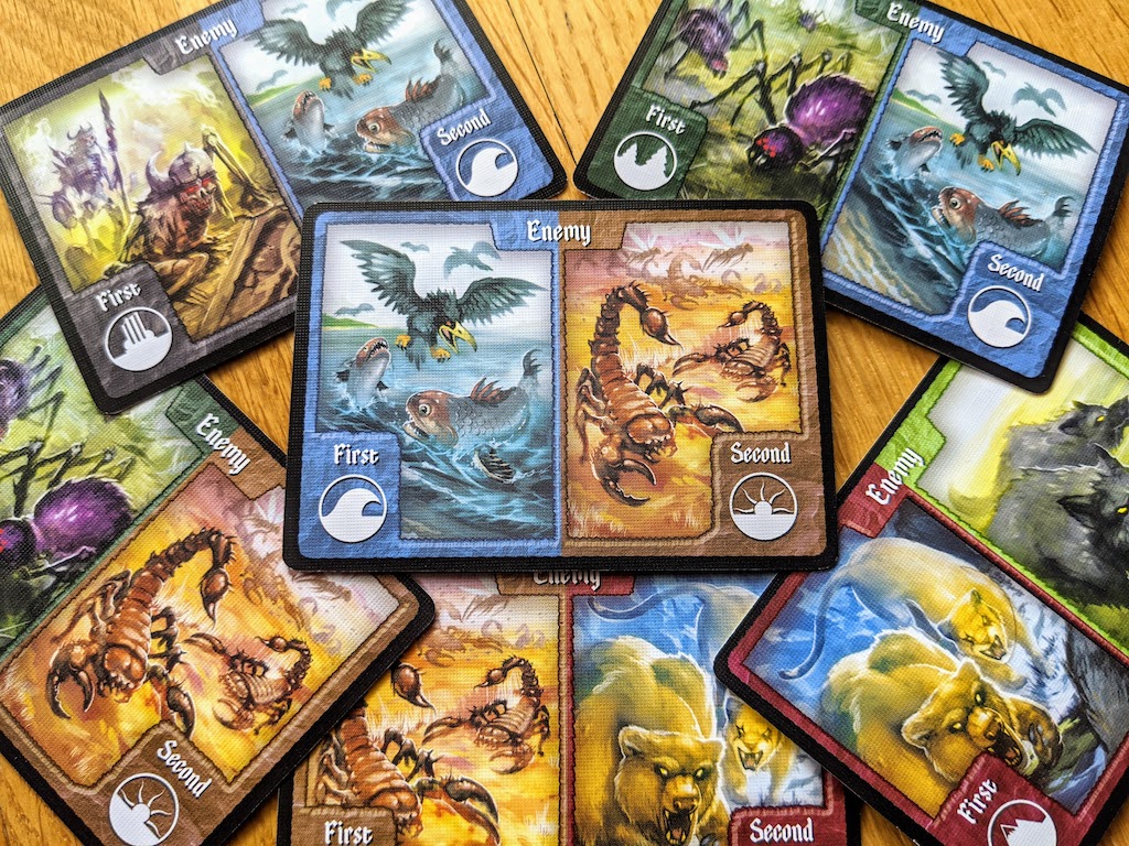 Verteidigt man ein Gebiet gegen einen der stärkeren, schrecklichen Gegner, wird diese Selbstlosigkeit reich belohnt. Die Spielerin/der Spieler darf eine Karte vom Artefaktstapel ziehen, sich das dazugehörige Artefakt nehmen und es an ihre/seine Spielfigur heften. Das sieht nicht nur unglaublich putzig aus, sondern bringt der Spielerin/dem Spieler einen permanenten Vorteil im epischen Kampf gegen die Feinde.