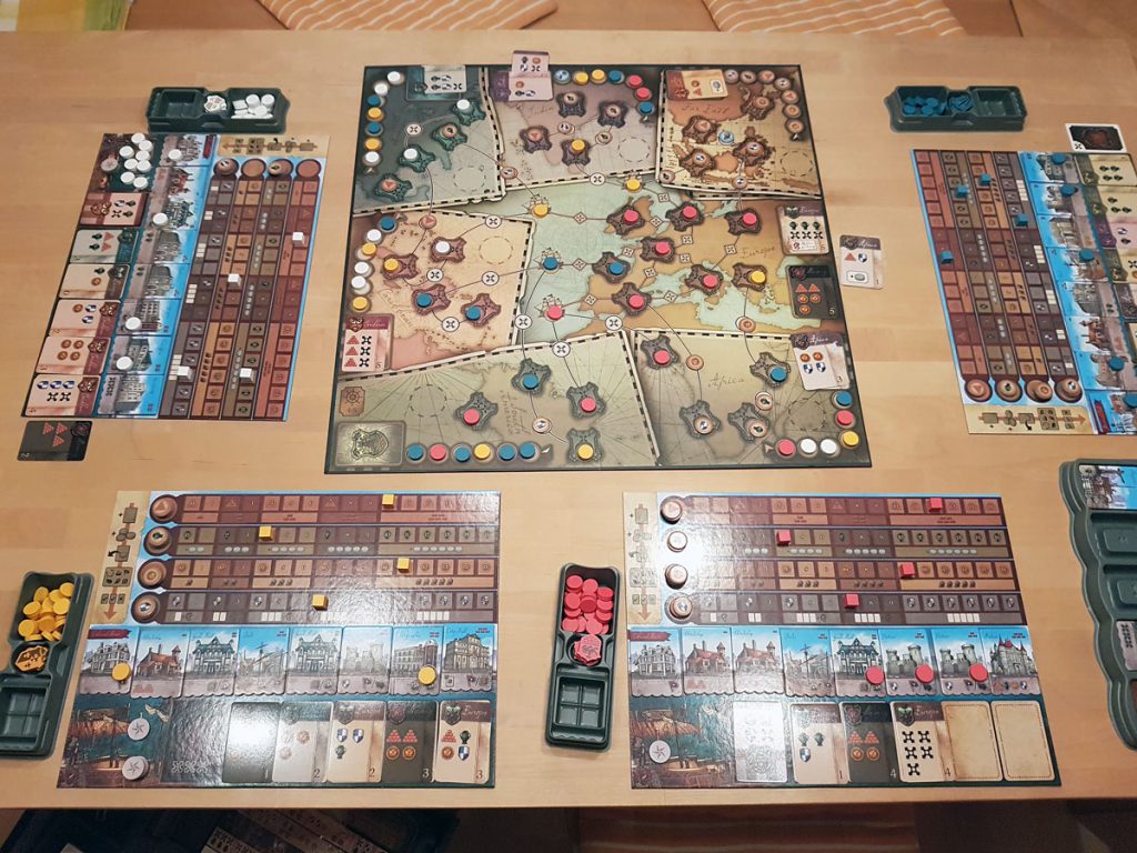 Das ist richtig gut miteinander verzahnt und trotzdem spielt es sich schnell und flüssig. In Europa gibt es dann auch noch die Sklavenkarten. Die sind ziemlich stark. Und wer jetzt wegen der Sklaverei im Spiel aufschreit – ruhig Blut. Denn es gibt auch die Möglichkeit, die Sklaverei im Spiel abzuschaffen. Das kann ein Spieler, der in Europa genug Präsenz zeigt und die entsprechende Karte nimmt. Die Folge ist für die „Sklaventreiber“ verheerend, denn sie müssen dann alle ihre Sklavereikarten abgeben und verlieren sofort ihre entsprechenden Fortschritte. Das ist noch so ein genialer Moment im Spiel.
