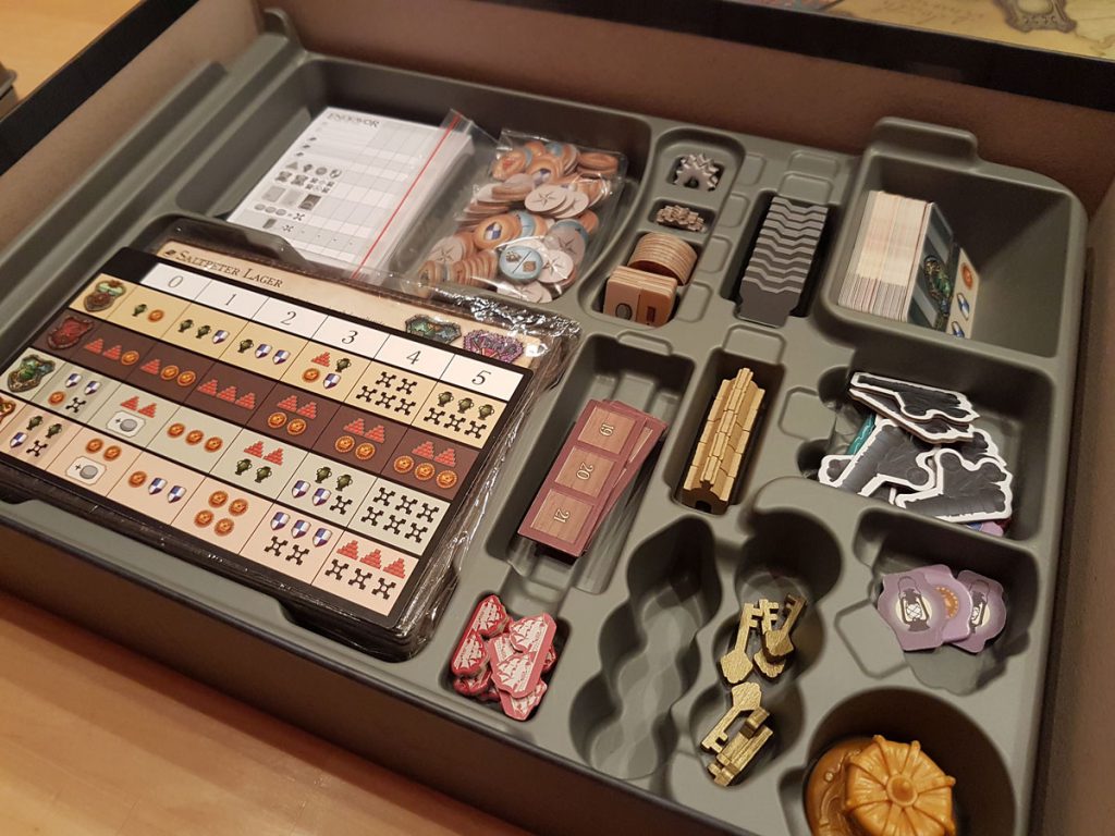 Das Material ist bestechend, eine große Schachtel, alles perfekt untergebracht, eigene Plastikschalen für die einzelnen Spieler, große Ablagetafeln, vorbildlich. Und das muss es auch sein, denn der Spielaufbau ist ziemlich fizzelig, da man 95 Marker auf dem Spielplan verteilen muss. Aber das geht schnell von der Hand und schon beginnt ein wirklich tolles Spielerlebnis.