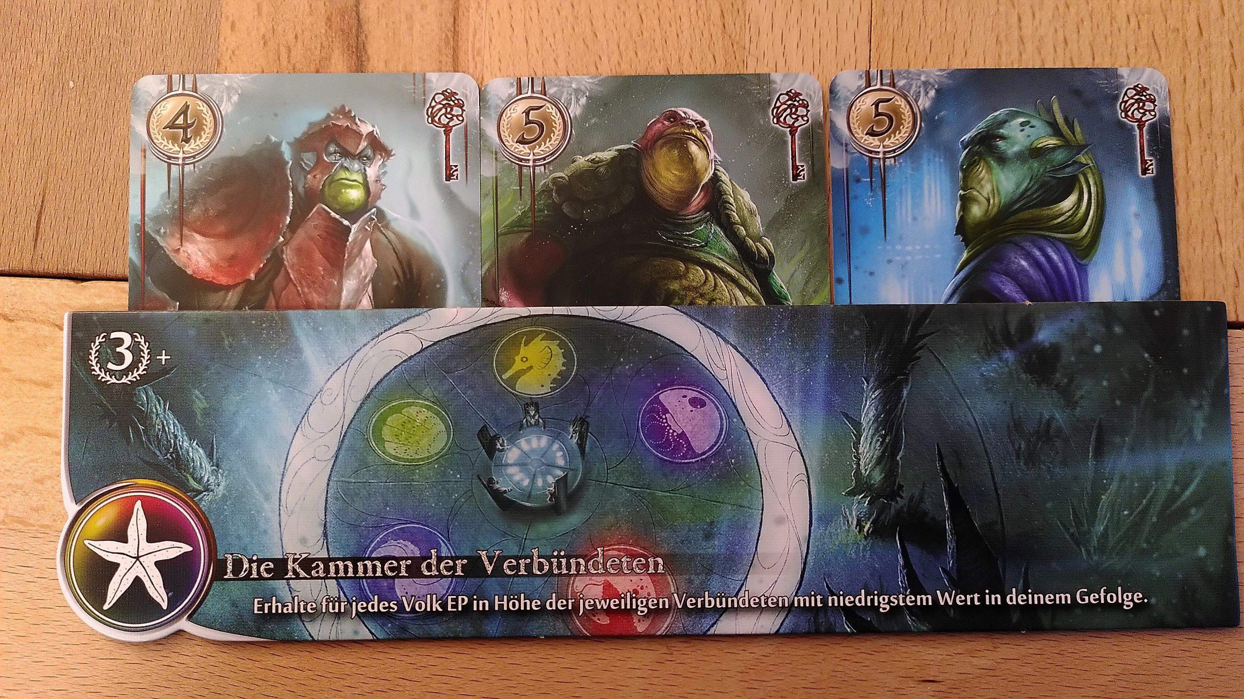 Zu zweit haben der Ablauf und die Systematik des Spiels leider einen Haken. Wer startet muss eigentlich immer zuerst die Tiefsee erkunden. Wenn da nicht sofort etwas Perfektes dabei ist, hat die zweite Person anschließend eine schöne Auswahl an verdeckten Ratsmitgliedern, die auf die Hand genommen werden können, es muss nicht nochmal die Tiefsee erkundet werden. Danach ist wieder der Startspielende dran und darf schon wieder die Tiefsee erkunden, weil fast nichts mehr verdeckt ausliegt.