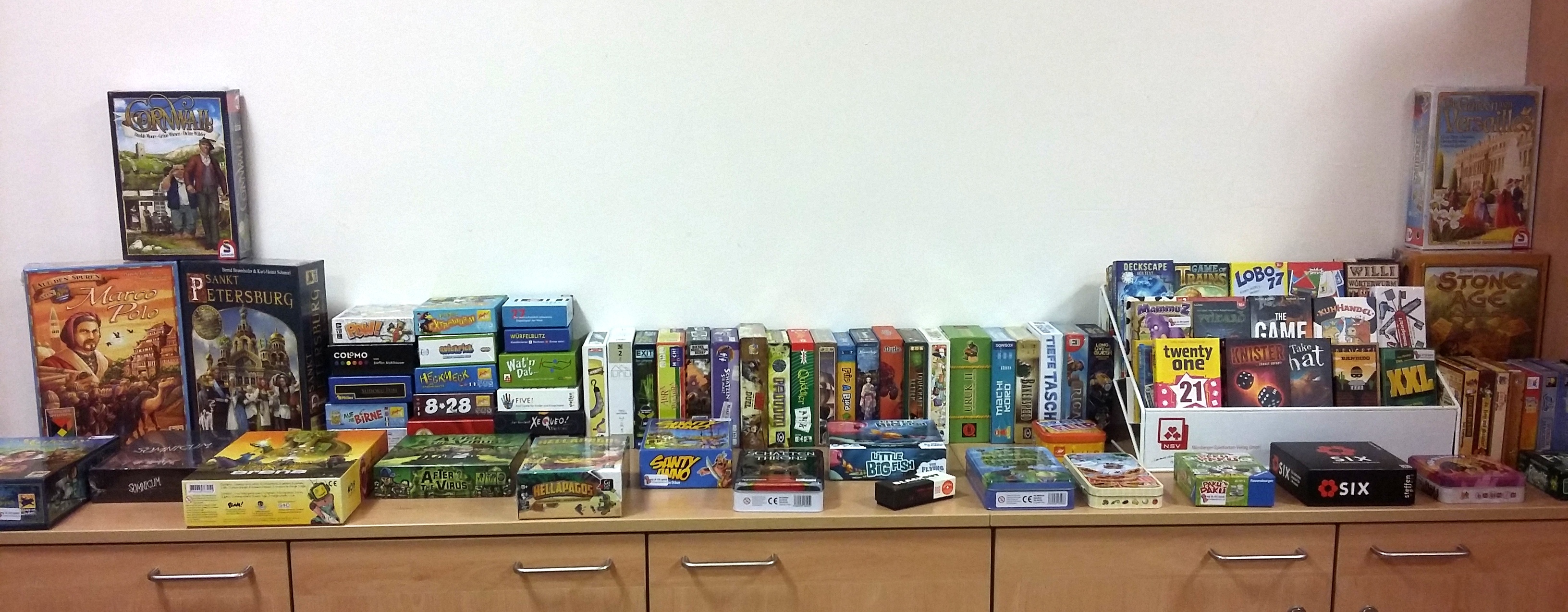 Zum einen hatten wir für Spiele und Zubehör einen Förderantrag beim Spiel des Jahres Verein gestellt. Wir dürfen mit Freude verkünden, dass der Antrag genehmigt wurde und wir für drei Jahre jährlich unterstützt werden. Vor allem der Zukauf von Spielen für die pädagogische Arbeit in Altenheimen, Kindergärten und Schulen ist geplant, sowie Spiel-des-Jahres-Spiele und ein paar wenige Besonderheiten für Expertenspieler. Auch ein Regal für unser Lager ist angedacht, so dass hier mehr Stellfläche entsteht.