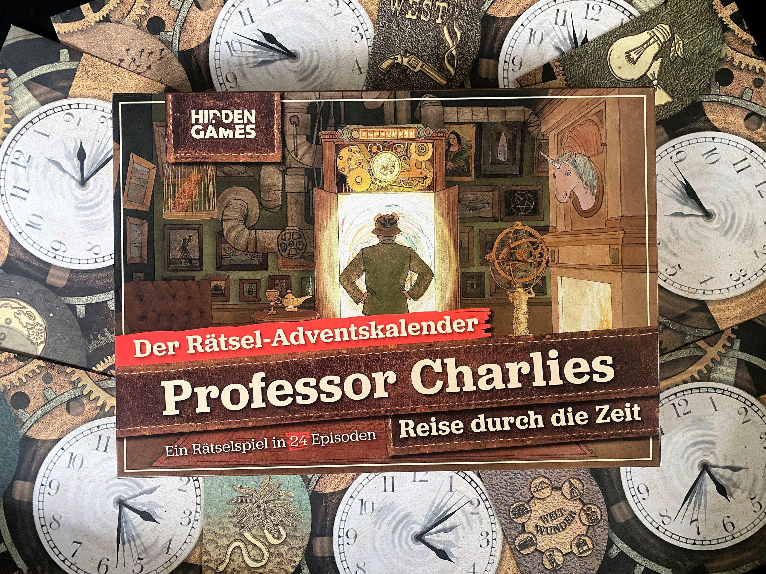 Na, an was denkt ihr, wenn ihr in einer Box vierundzwanzig einzelne Rätsel findet? Klar, an einen Rätsel-Adventskalender. Und so steht es auch als Untertitel auf der Schachtel von „Professor Charlies Reise durch die Zeit“. Für alle Weihnachtsmuffel, wie mich, habe ich aber eine frohe Botschaft: das Spiel funktioniert das ganze Jahr über, und nicht nur im Winter, wenn es schneit!