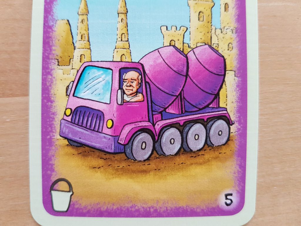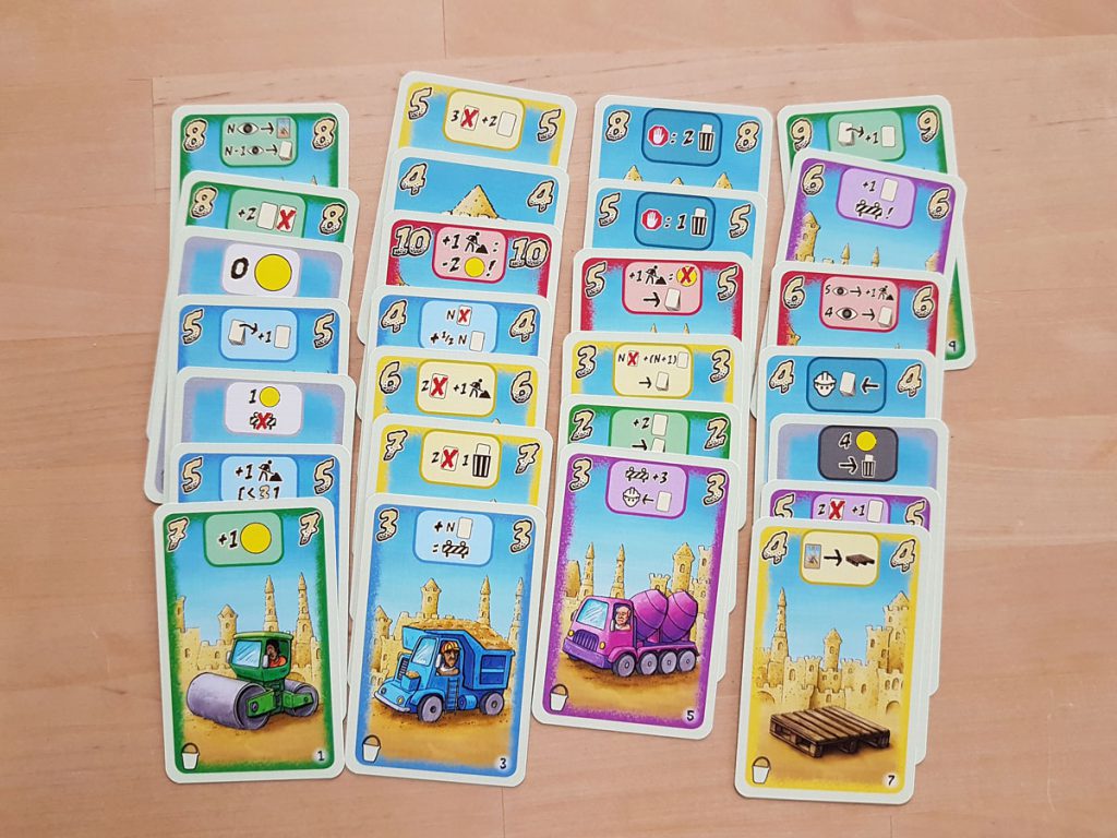 Nun, das Spiel bietet eigentlich nichts davon. Sandburgenbauen ist nur Nebensache, Meer und blauer Himmel sieht man vielleicht auf den Karten, und entspannen kann man bei diesem Spiel schon gar nicht. Es ist ein ziemlich knallhartes Wettrennen. Und dabei geht es nicht um Aufbauen (wie das Thema Sandburgen vielleicht verspricht), nein, es geht um Abbauen.