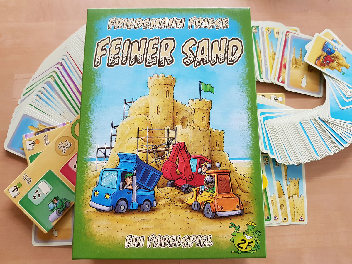 Feiner Sand von Friedemann Friese, Grafiken von Harald Lieske, für 1 – 4 Spieler ab 10, erschienen 2018 bei 2F-Spiele, ist ein Deck-Abbau-Spiel, bei dem man versucht, seine Karte so schnell wie möglich loszuwerden. Anfangs strategisch, später eher vom Wettrennen geprägt, ist es für zwei bis vier Spieler gleichsam spannend, auch die Solo-Variante hat seinen eigenen Spielreiz. Richtig genial ist die sogenannte Fabelkampagne. Hier werden nach jedem Spiel drei Karten aus dem Deck entfernt und durch drei neue vom Nachfüllstapel ergänzt. So entsteht ein sehr hoher Wiederspielreiz, sehr gelungen.