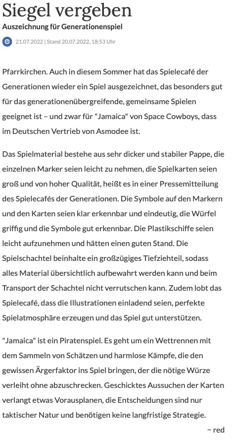 - Familienspiel- und Kinderspielmagazin: Jamaica von Space Cowboys, Vertrieb Asmodee erhält das Generationenspiel-Siegel