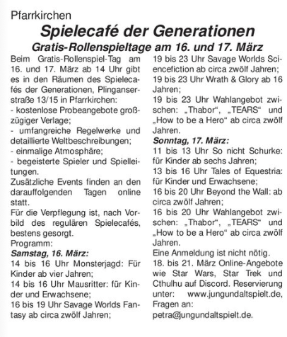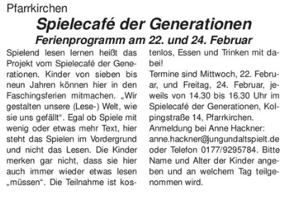 - Ev. Kirchengemeinde Mörlenbach: Spielenachmittag einmal im Monat mit dem Spielecafé der Generationen