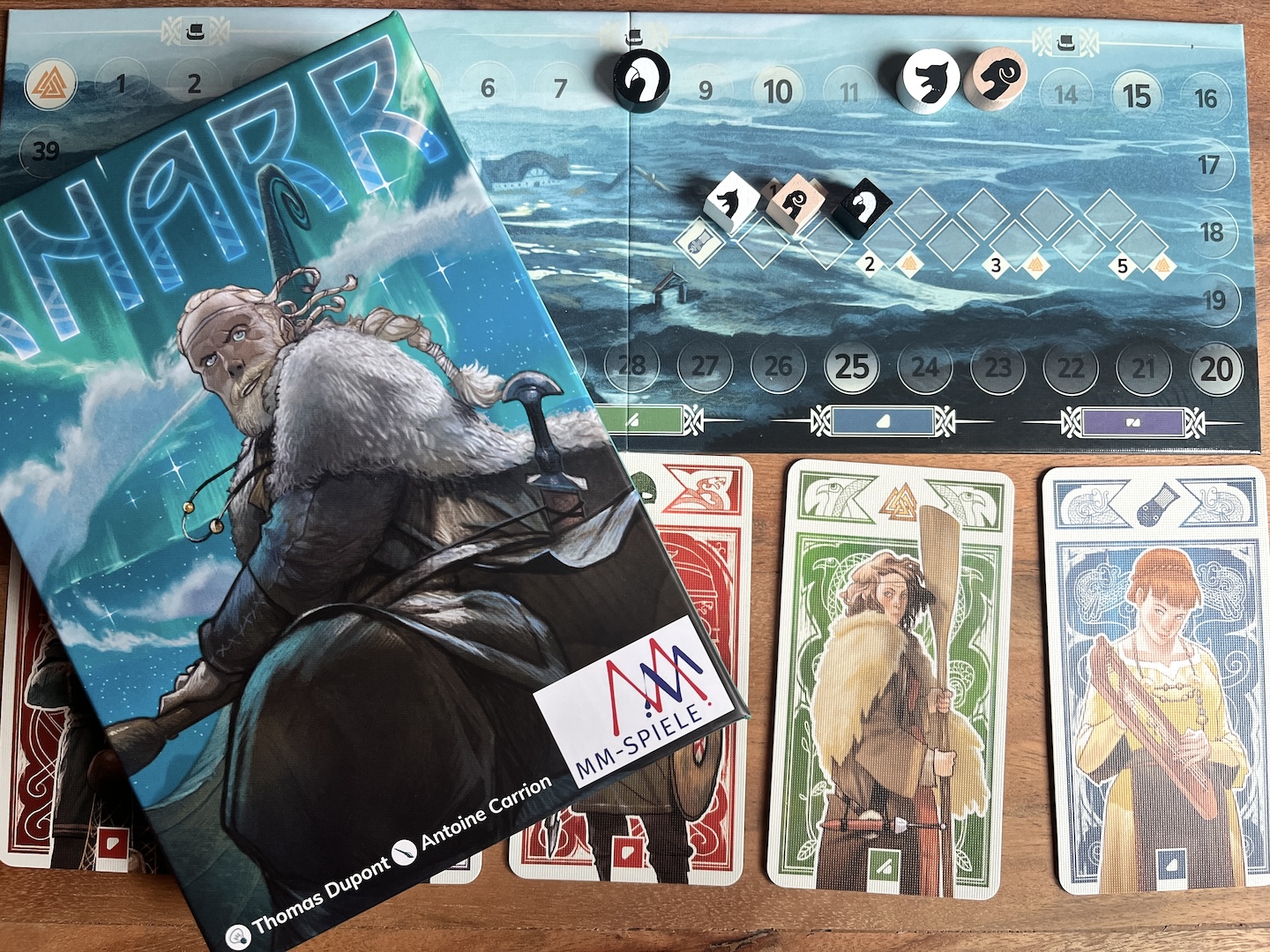 Bei ‚Knarr‘ nimmst du an einem Wikinger-Wettrennen teil. Wer zuerst die 40-Punkte-Sieglinie überschreitet, löst das Spielende aus. Wer letztlich die meisten Siegpunkte erspielt hat, gewinnt ein äußerst interessantes Kartenspiel.