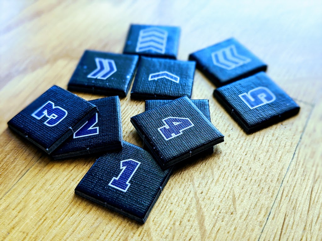 In vielen der Missionen kommen außerdem spezielle Auftragsplättchen zum Einsatz. Sie werden nach einem vordefinierten Schema auf die Auftragskarten gelegt und geben Bedingungen für die jeweilige Karte vor. Beispielsweise welche der Auftragskarten als erstes oder als letztes gestochen werden muss. Zu guter Letzt werden die offen ausliegenden Auftragskarten inklusive der Plättchen an die Spielerinnen und Spieler verteilt. Allerdings darf man sich bei der Verteilung nicht absprechen, sondern muss sich still und heimlich reihum einen der offenen Aufträge aussuchen, bis alle vergeben sind.
