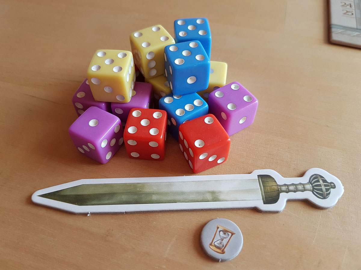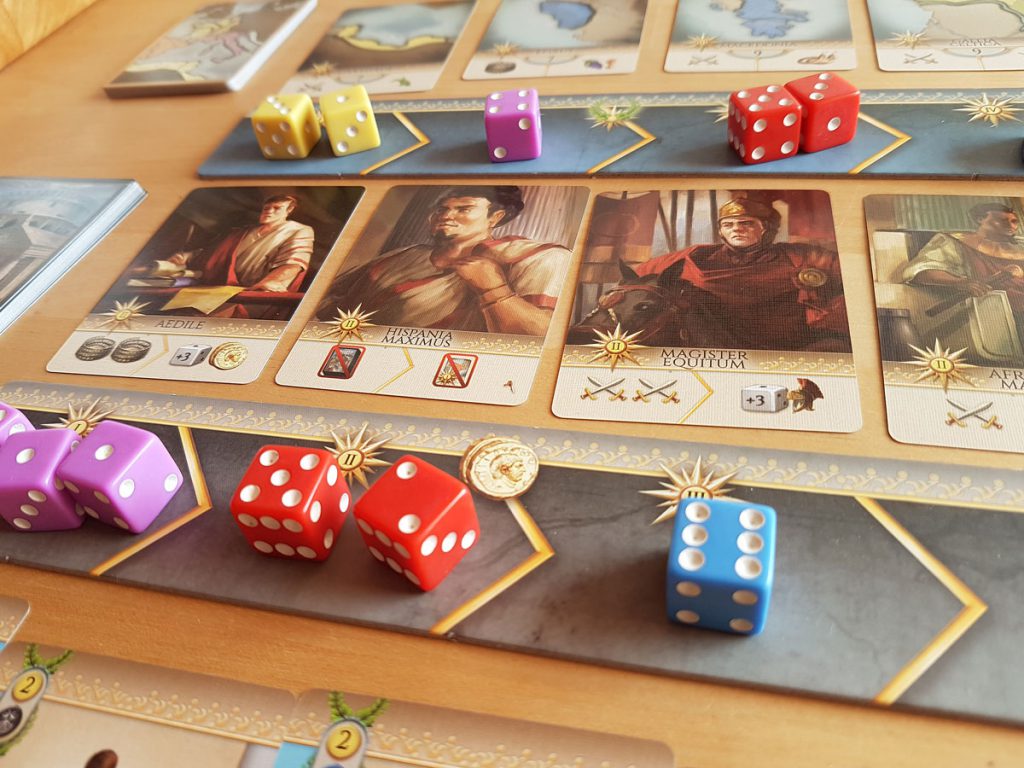 Oh, hab ich einfach gesagt? Ja, die Regeln sind einfach. Zu Beginn der Runde würfelt jeder seine vier Würfel. Dann setzt man abwechselnd einen Würfel auf drei Machtleisten: Militär, Senat und Schwarzmarkt. Wichtig dabei: Setzt man einen Würfel, der kleiner als bereits vorhandene ist, darf man mit diesen die Position tauschen. Setzt man einen Würfel zu einem eigenen bereits eingesetzten Würfel dazu, darf dieser höchsten die Augenzahl haben wie der vorhandene Würfel. So kann man die Macht erhöhen, ohne auf der Leiste nach hinten zu fallen. Wichtig ist, wer vorne ist, also den kleineren Würfel eingesetzt hat, darf zuerst wählen.