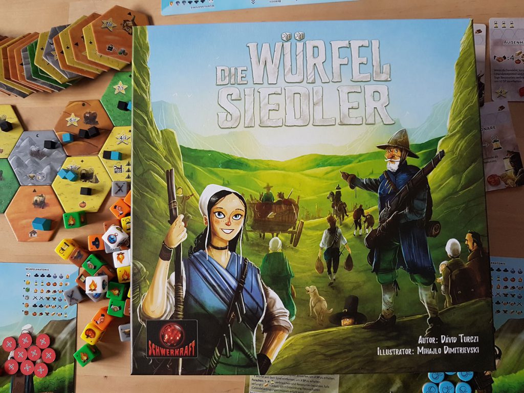 „Die Würfelsiedler“ von David Turczi für 1-4 Spieler ab 14, ca. 90 Minuten, erschien 2018 im Schwerkraft-Verlag ist ein gut ausgestattetes Kennerspiel