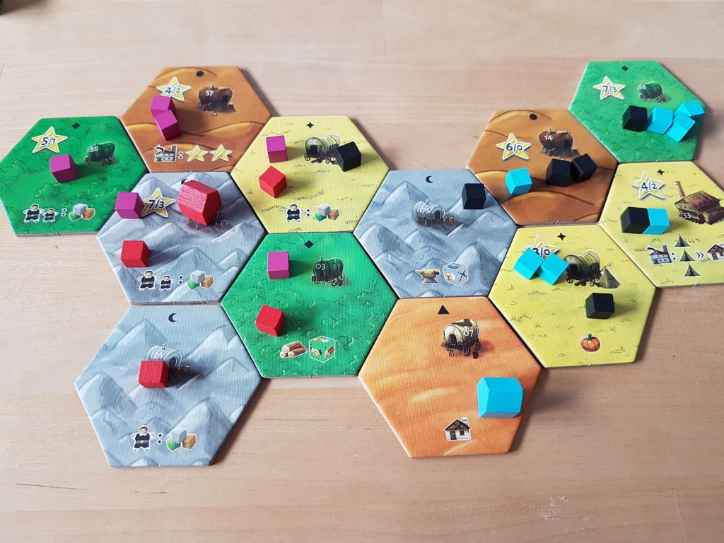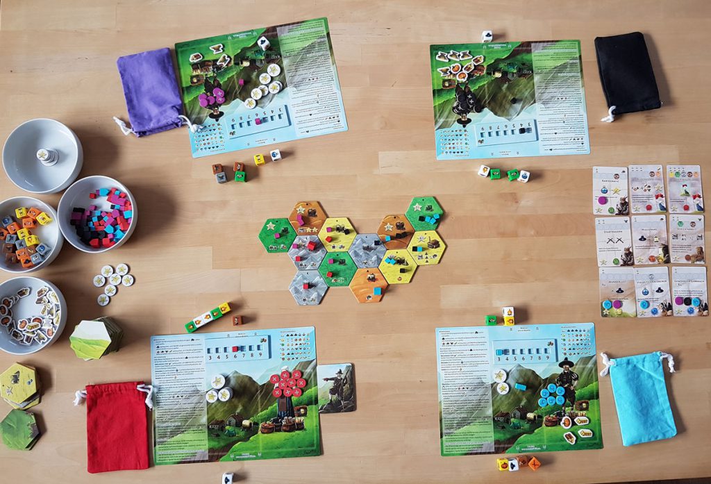 Anfangs mag das Spiel zu viel Glück aufweisen. Aber schnell lernt man, worauf man achten muss. Das kommt auf die Strategie an, die man fährt. Schnell ausbreiten und viele Punkte machen durch die ausliegenden Plättchen, immer nur Rohstoffe sammeln und in Punkte wandeln, die Gegner immer wieder empfindlich stören durch die Aktion Angreifen. Das Besondere, was das Spiel spannend macht ist, dass zu Beginn eine bestimmte Anzahl an Siegpunkten ausliegt. Sind sie vergeben, läutet es das Ende des Spiels ein. Schnell Punkte machen setzt also die Mitspieler gehörig unter Druck. Spielen alle auf Ausbreiten, kann das Spiel schon mal lange werden.