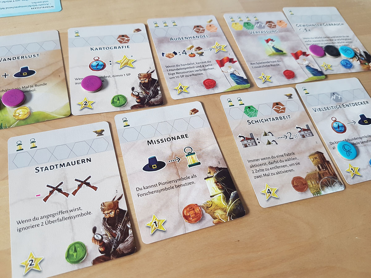 Nicht außer acht lassen sollte man die Errungenschaften, davon sind neun im Spiel. Manche sind schwach, andere sind immens wichtig. Gut dass jeder diese Karten „erforschen“ kann und somit stehen die Vorteile jedem zur Verfügung, wenn er denn rechtzeitig die Voraussetzungen dafür schaffen kann. Mitgeliefert werden 55 solcher Karten. Das ergibt eine große Varianz und es stellt jedesmal einen neuen Reiz dar, diese Karten und ihre dauerhaften teils großen Boni in sein Spielverhalten zu integrieren. Da wird es nicht so schnell langweilig.