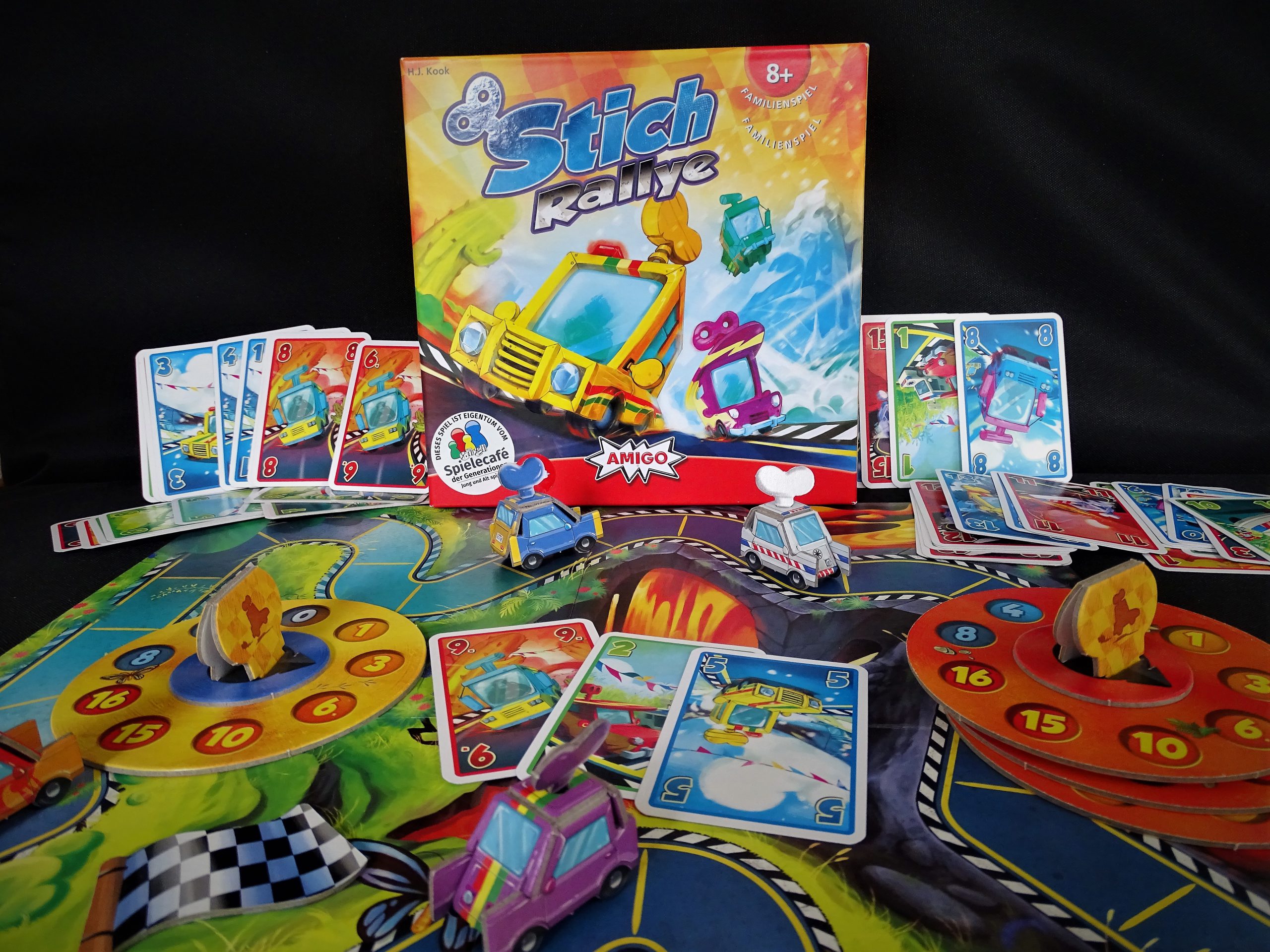 Stich Rallye ist ein Familienspiel von H.J. Kook und bei Amigo erschienen. Es ist für 3-5 Spielende geeignet und kann ab 8 Jahren gespielt werden.