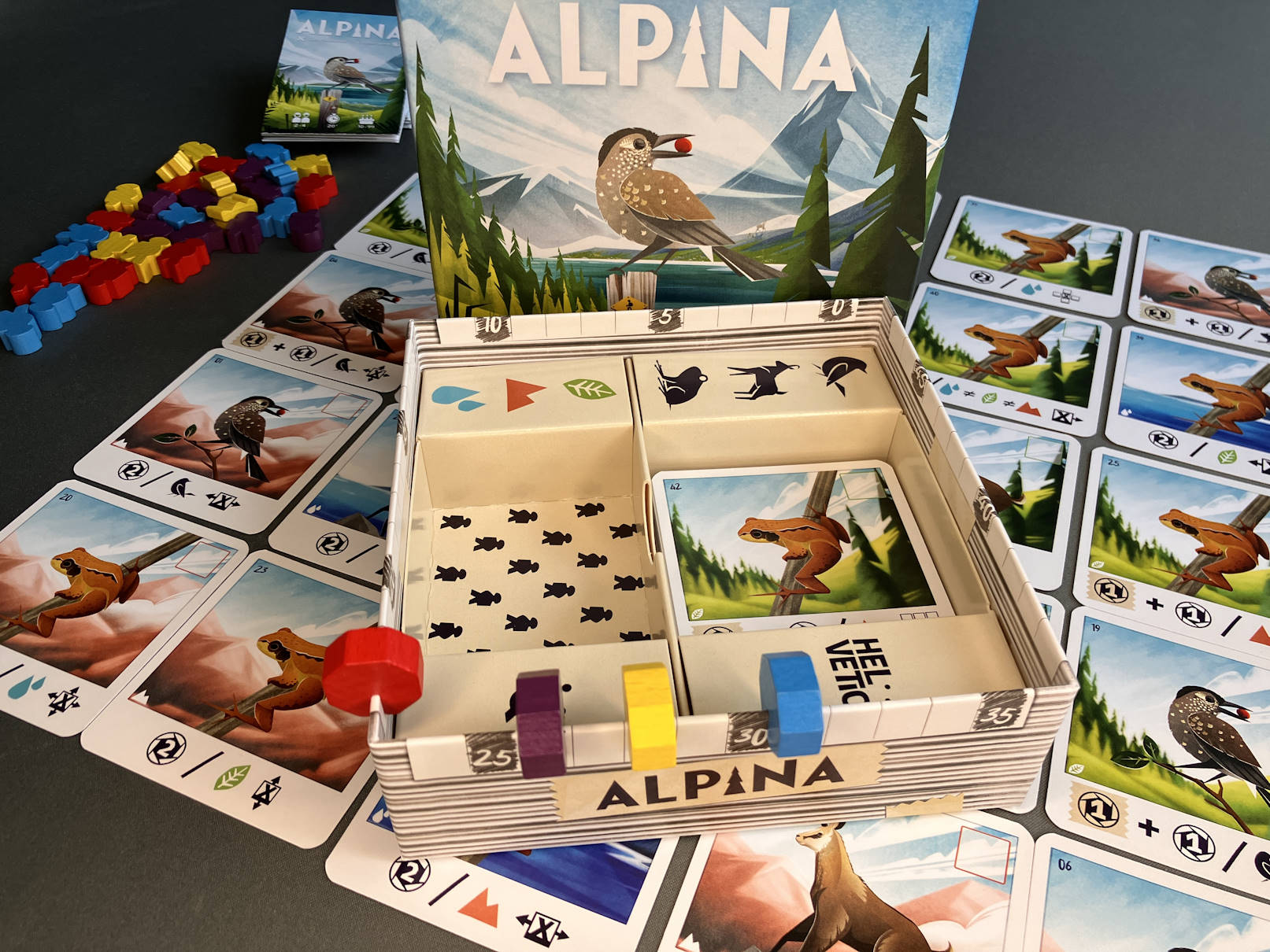 Dann wird Karte für Karte gewertet. Jede Karte bringt dabei genau der Person Punkte, die ihren Wanderer darauf platziert hat – auf einer Karte steht niemals mehr als 1 Figur. Vögel bringen Punkte für Tiere in der Umgebung, während die Frösche Landschaften in ihrer Reihe oder Spalte bevorzugen. Gämsen bringen Punkte für mit Wanderern besetzten Karten. Zur Auswertung der Punkte bei Spielende kann ganz elegant die Spielschachtel genutzt werden, die Marker gibt es inklusive.