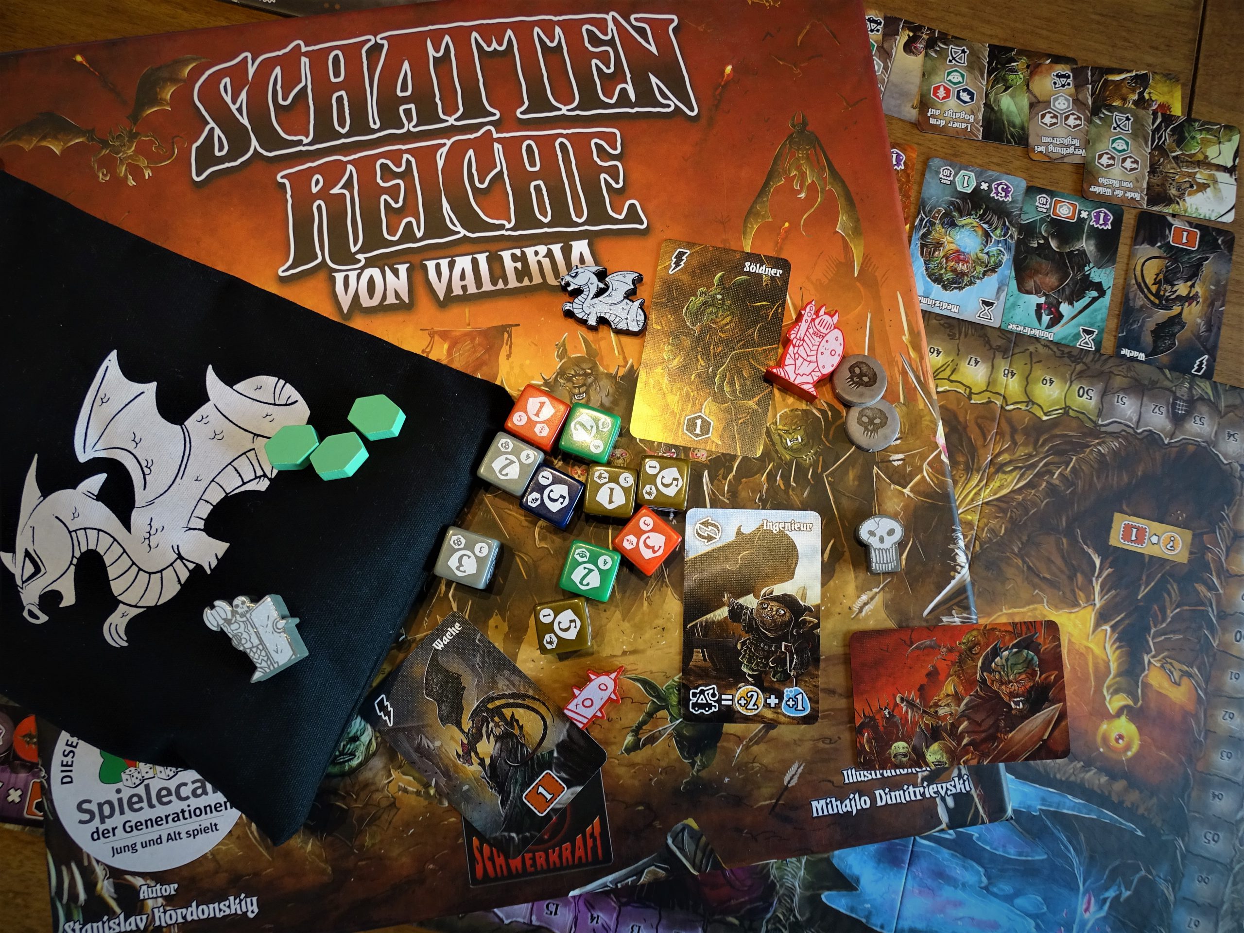 Die ‚Schattenreiche von Valeria‘ sind absolut einen Besuch wert, wenn man einen leichten Einstieg in die Welt der Kennerspiele sucht. Die Regeln sind schnell verinnerlicht, bei den Symbolen holt man sich einfach Hilfe bei den anderen oder schlägt in der Spielanleitung nach. Die vielen Entscheidungen, die man fällen kann, wenn man einen Eroberungsmarker-Marker von dem einem auf das andere Tableau umsetzt, machen das Spiel aber dann doch recht komplex. So entsteht zumindest bei mir immer wieder Lust auf eine nächste Runde, in der ich etwas ausprobieren will. Mit der kleinen Prise Magie kann ich sogar nachhelfen, wenn die Auslage nicht passt – das kommt gut! Aber ja: Zufall und Kennerspiel – die alte Grundsatzdiskussion muss hier nicht aufgewärmt werden.