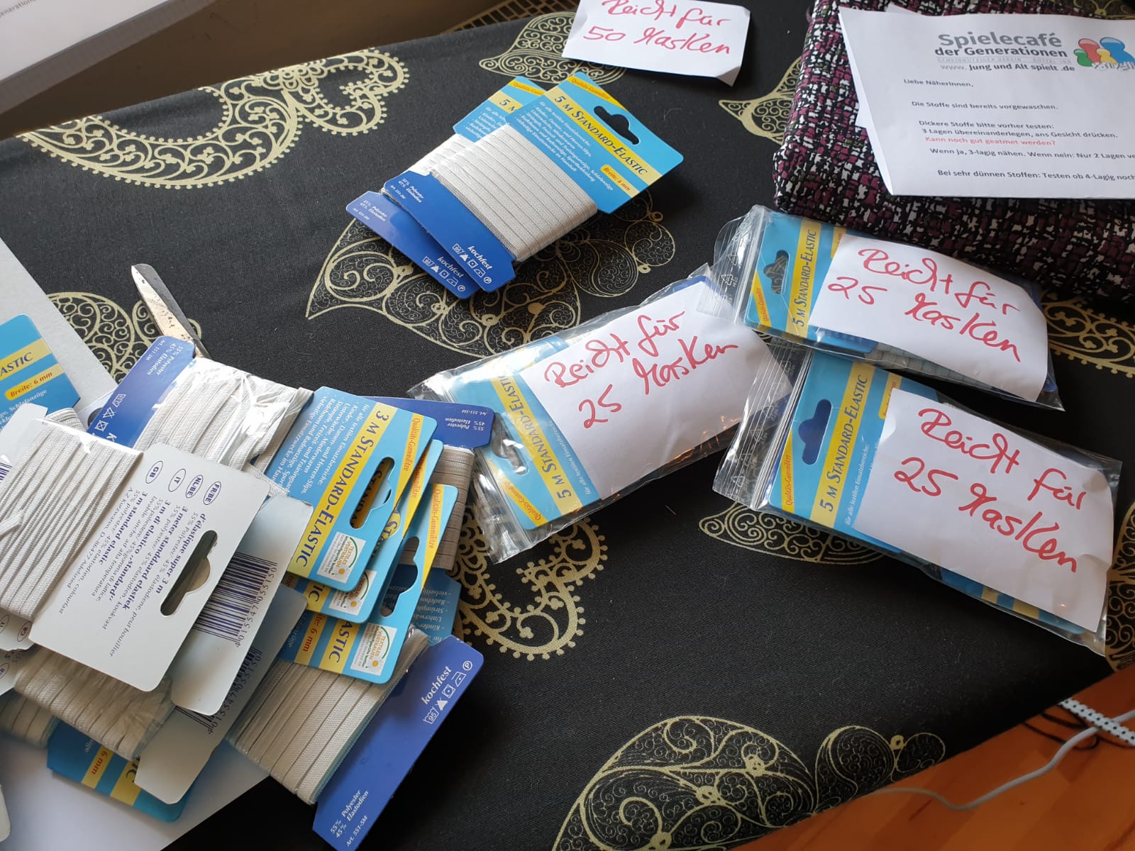 Das Material war zwischendurch knapp. Stofflieferungen trudeln täglich bei uns ein (Bitte keine Dekostoffe bringen, nur reine Baumwolle wie Bettwäsche und Co). Doch Gummibänder sind Mangelware. Wie schön, dass heute ein paar Engel vorbei kamen und wir mittlerweile 700 Meter Gummibänder verteilen können. Vielen vielen Dank. Neben den im gestrigen Artikel genannten Firmen, kamen noch großzügige Spenden von Betty Barclay aus Arnstorf und dem Edeka aus Schönau herein. Außerdem ist das NÄHsthäkchen tatkräftig als Verteilstation mit an Board.