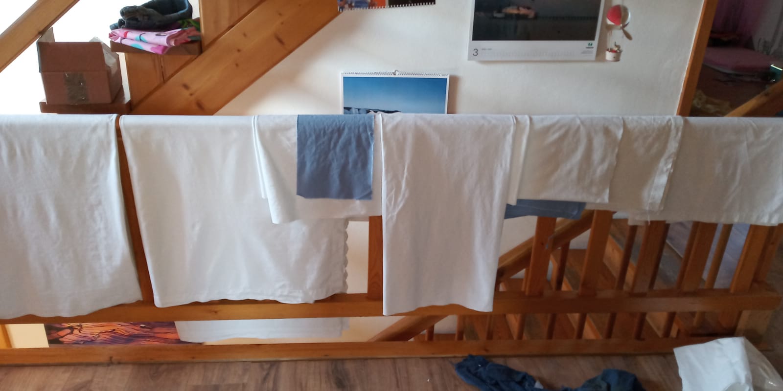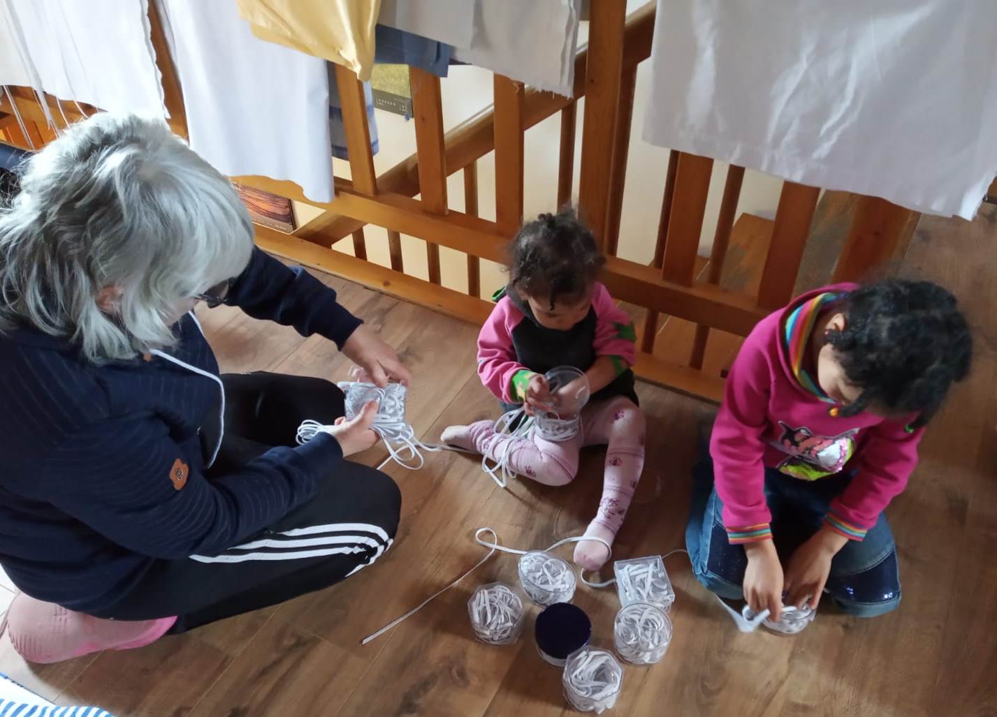 Auch die Verteilstationen sind gut beschäftigt. Es gilt Stoffe zu sichten, zu waschen, in Pakete aufzuteilen und Gummibänder zu portionieren. Alles das wird dann in Garage und Carport zur Abholung bereitgestellt. Aber es gilt auch zu telefonieren, Anfragen zu beantworten und die Logistik zu organisieren. Mittlerweile haben wir Helfer für das Waschen von Stoffen und für das Verteilen von Spenden zwischen den zwei Verteilungsstationen.