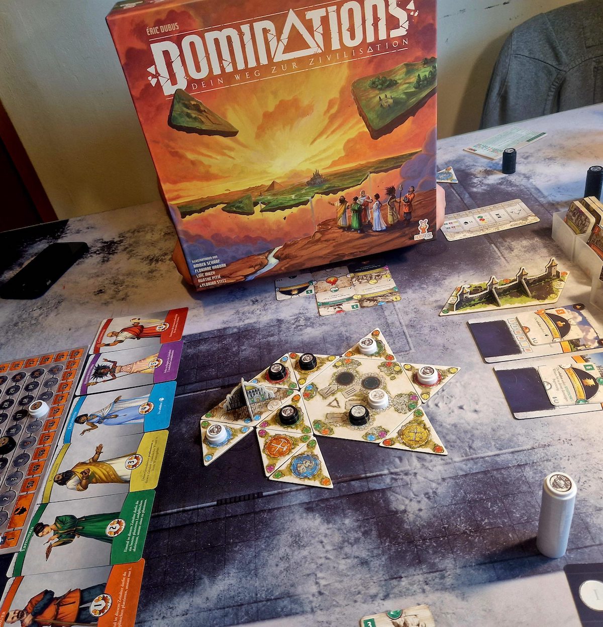 Umso mehr hat es mich gefreut „Dominations“ zu entdecken, ein Zivilisationsaufbauspiel ohne Kampfelemente – außer ihr nutzt die Erweiterung – und dennoch schön komplex.