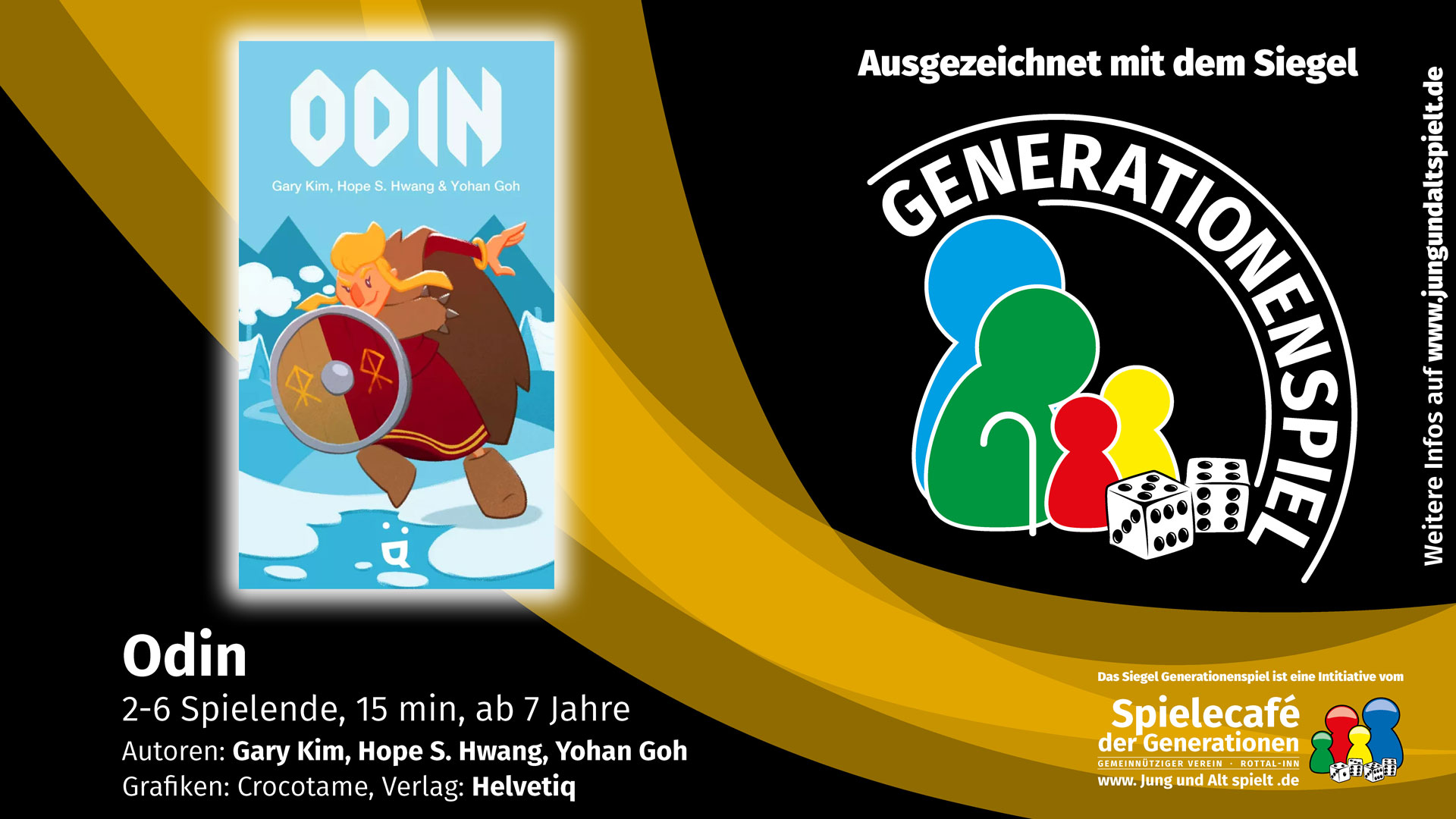 Generationenspiel ist das Qualitätssiegel für Gesellschaftsspiele. Es zeichnet Spiele aus, die besonders gut geeignet sind, gemeinsam von Jung bis Alt, also generationsverbindend gespielt zu werden. HIER erfahrt ihr mehr zum Siegel (Klick)! Odin erhält das Siegel Generationenspiel (Ausgabe 2024, Helvetiq) Spielidee: Gary Kim, Hope S. Hwang und Yohan Goh Grafik: Crocotame Verlag: Helvetiq (Vertrieb Hutter Trade) Anzahl … Weiterlesen