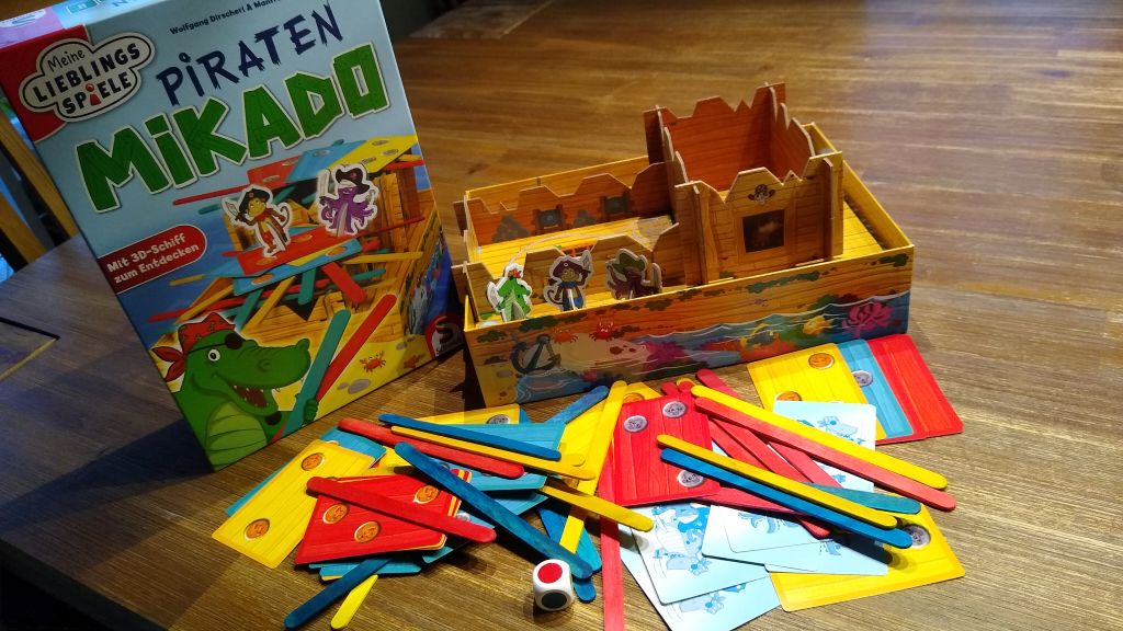 Mikado als Doppelpack, mit Karten und Würfeln und Planken, die aussehen wie Eisstiele. Dazu als Piraten verkleidete Tiere. Eine wilde Kombination erwartet Kinder und Erwachsene ab 5 Jahren. Ruhige Hände vorausgesetzt, sammelt man mehr Münzen, als die anderen und gewinnt das Spiel.