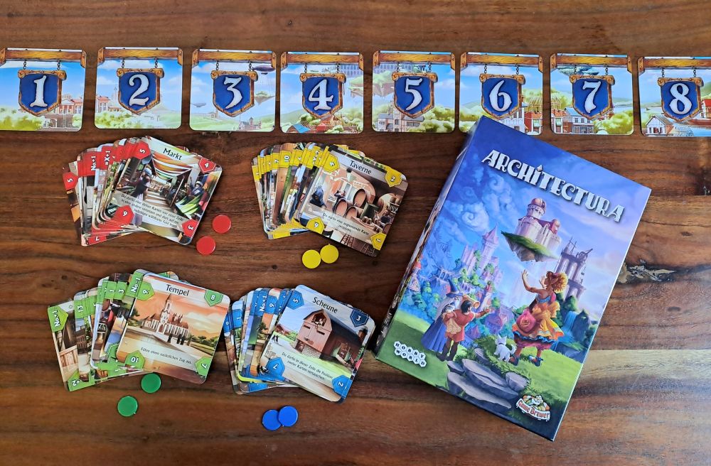 Und da hätten wir auch schon das Spielprinzip von „Architectura“. Ihr baut Tempel, Villen und Märkte und verbessert oder verschlechtert dabei den Wert der angrenzenden Gebäude. Da bleibt es bis zum Schluss spannend, wer sich den höchsten Immobilienwert erbauen kann.