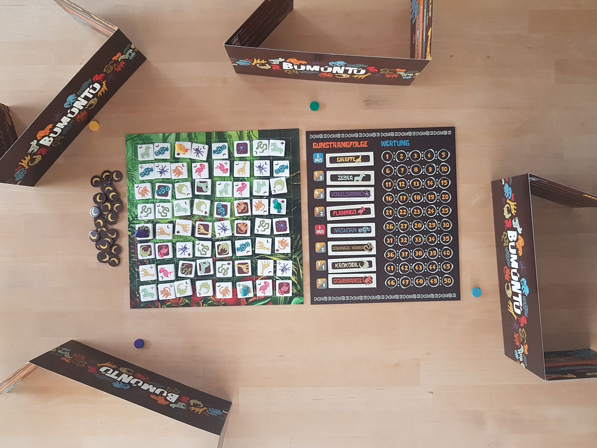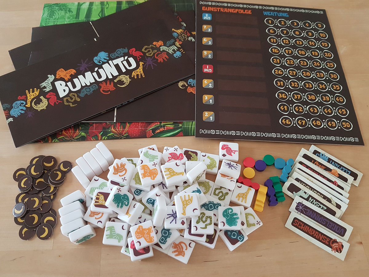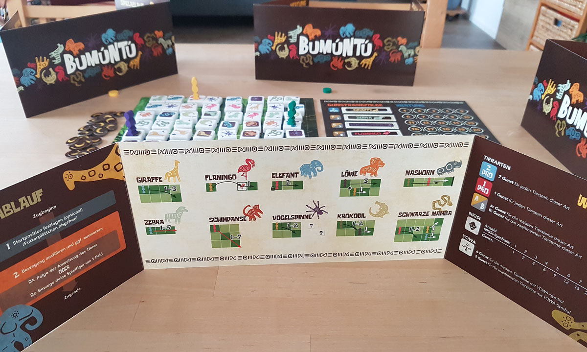 Bumuntu ist ein strategisches abstraktes Familienspiel, das gewisse Ansprüche stellt aber herrlich einfach und umkompliziert zu spielen ist. Schnell und einfach erklärt und bietet nicht nur für Kids wunderbare Unterhaltung. Durch die Tiere und die Geschichte wird man in das Spiel förmlich hineingezogen, Material und Grafik sind spieleinladend, nur die Spielfigur fällt sehr leicht um.