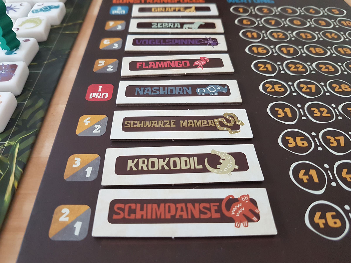 Und genau das Letztere ist ein weiterer toller eigenständiger Mechanismus, der perfekt zum Zugmechanismus passt. In der Wertungstafel sind nämlich die im Spiel vorhandenen Tiere aufsteigend angeordnet und für jeden Platz gibt es unterschiedliche Wertungen am Spielende. Ich kann die Reihenfolge der Tiere ändern und kann so meine gesammelten Steine wertvoller machen.