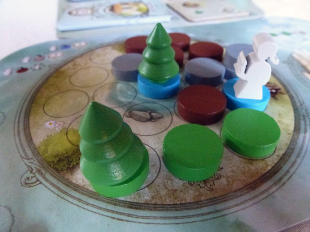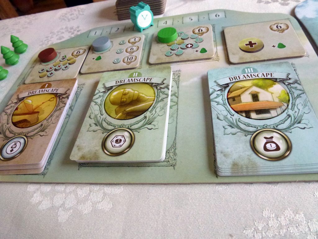 Zum Kauf veranlasst hat mich das wunderschöne Spielmaterial von Dreamscape. Kleine filigrane Holzfiguren als Träumer und Schläfer, ein Wecker als Rundenanzeiger, kleine Kerzen als Phasenmarker, wunderschön gestaltete Karten, Spielertableaus und ein Spielbrett, Dreamscape ist ein schöner Hingucker auf dem Spieltisch.