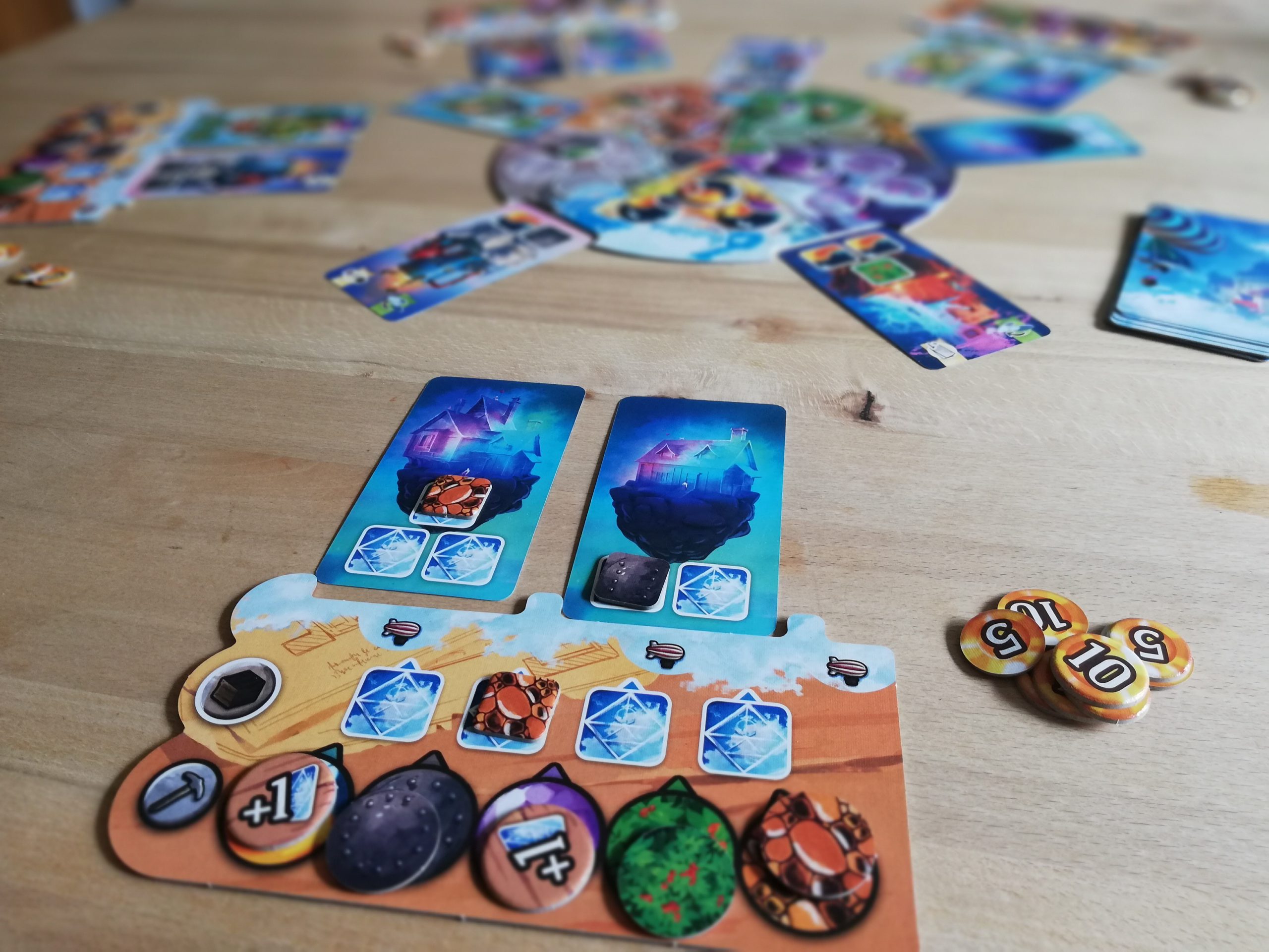 Wer seine Ressourcen verwendet, also an die Baustelle liefert und diese dadurch fertig stellt, erhält Geld – die Siegpunkte bei Welkin. Doch wieviel Geld man erhält, richtet sich nach der Wertigkeit der Ressourcen. Zeigen z. B. drei Handelschips „Flora“ ist jede genutzte Flora auf der Baustelle 3 Geld wert. Ist die genutzte Ressource gerade gar nicht in der Mitte zu sehen, ist diese leider wertlos! Manche Baustellen haben weitere Aktionen, die nach ihrer Fertigstellung im Laufe des Spieles einmalig genutzt werden.