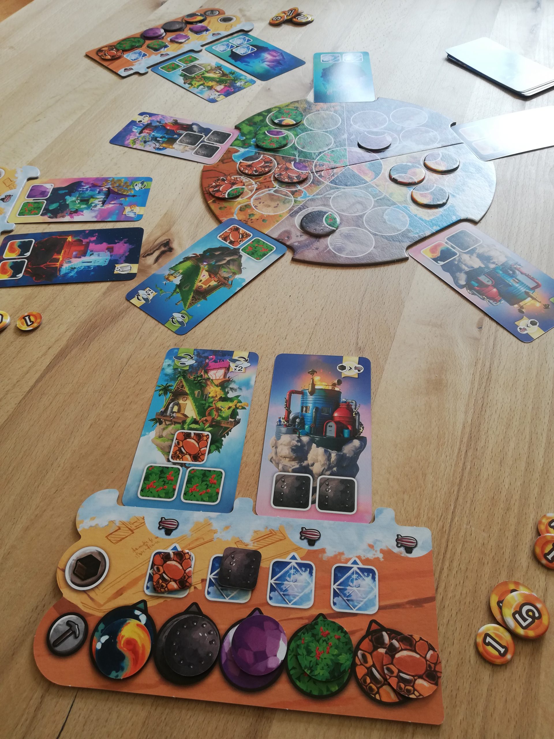 Auch beim Herstellen der Ressourcen kommt ein spannender Kniff hinzu. Einer der eigenen Produktionschips muss umgedreht werden und nur die sichtbaren Ressourcen dürfen genommen werden, die umgedrehten Ressourcen bestimmen die Menge.