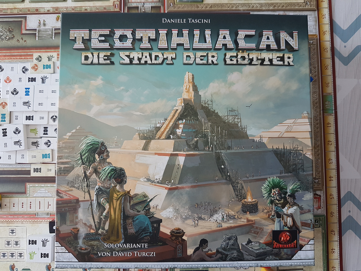 Teotihuacan – Die Stadt der Götter | 1-4 Spieler ab 14 Jahren | 120 min | von Daniele Tascini | Grafiken von Odysseas Stemoglou| erschienen im Schwerkraft-Verlag 2018 | ist ein ausgezeichnetes Kennerspiel mit perfekt verwobenen Spielmechaniken, tollem Material und für Intensivspielende perfekte Spieltiefe bei einfachem Regelwerk.