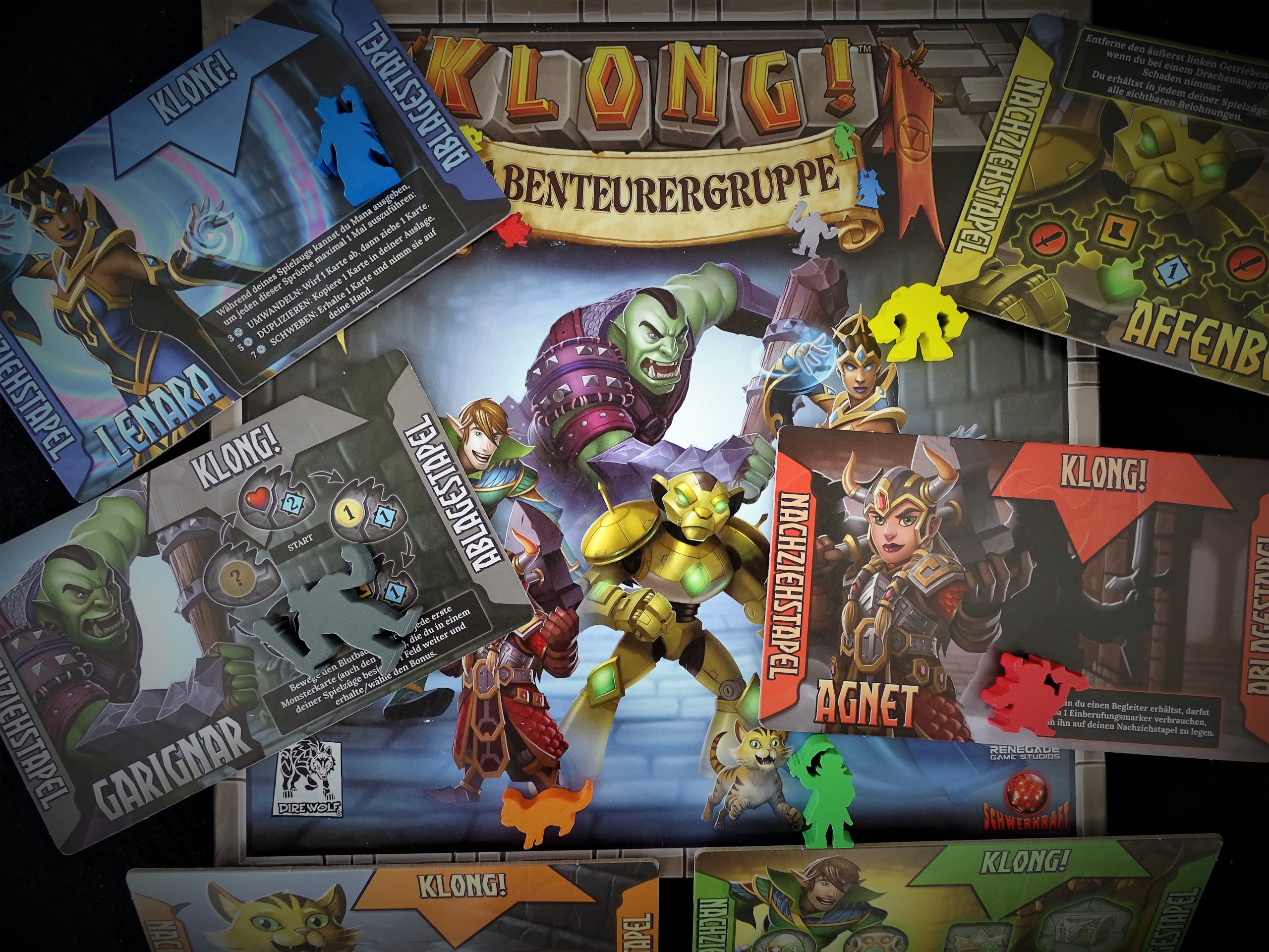 „Klong!: Abenteuergruppe“ ist eine Erweiterung zu dem Abenteuer-Spiel „Klong“, bei der man nun zu sechst auf Diebeszug in der Drachenhöhle gehen kann. Außerdem können nun zum Start einer Partie auch Spezial-Charaktere gewählt werden, die sich mit besonderen Startkartenstapeln in die Schatzjagd trauen.