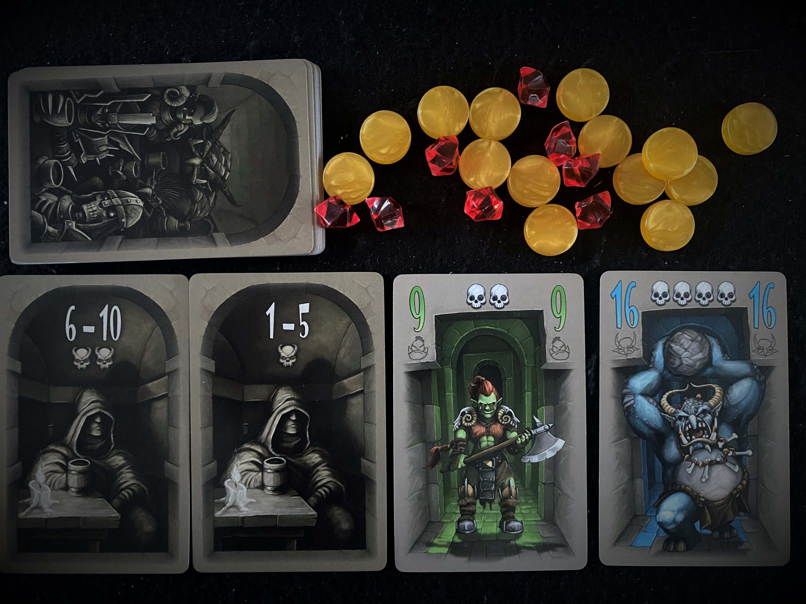 Die Schätze, mit denen wir um die Karten feilschen, bestehen aus Goldmünzen und Edelsteinen aus Kunststoff. Sie kennt man auch aus anderen Spielen und sind wirklich guter Standard. Wer über ausreichende Motorik verfügt, kommt damit sicher klar. Ansonsten ist das eine der Schwachstellen, wenn es um das generationenübergreifende Spielen geht. Wobei: Das Thema peilt schon sehr genau auf eine Zielgruppe mit Liebe zu epischen Helden, Drachen und Abenteuerlust an. Meine Schwiegereltern konnten mit Fantasy-Monstern so gar nichts anfangen, wunderten sich über die Schädel-Illustrationen, konnten aber die Karten wegen des guten Kontrasts prima erkennen – bevor sie das Spiel weggelegt hatten.