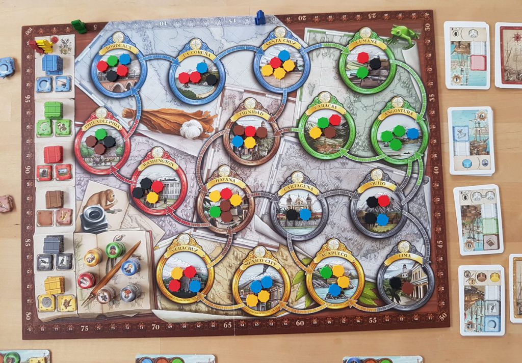 Und jetzt sind erstmal die anderen Mitspieler dran. So entsteht keine Langweile. Toll gelöst. Jeder darf sich nämlich jetzt einen Stein von einem der Orte nehmen und auf einen seiner Schiffskarten legen. Hat das jeder gemacht, darf ich mir für jede Stadt, auf die ich einen Stein in der Stadtfarbe gelegt habe, eine Kiste nehmen, die ich wiederum auf meine Schiffskarten legen darf.
