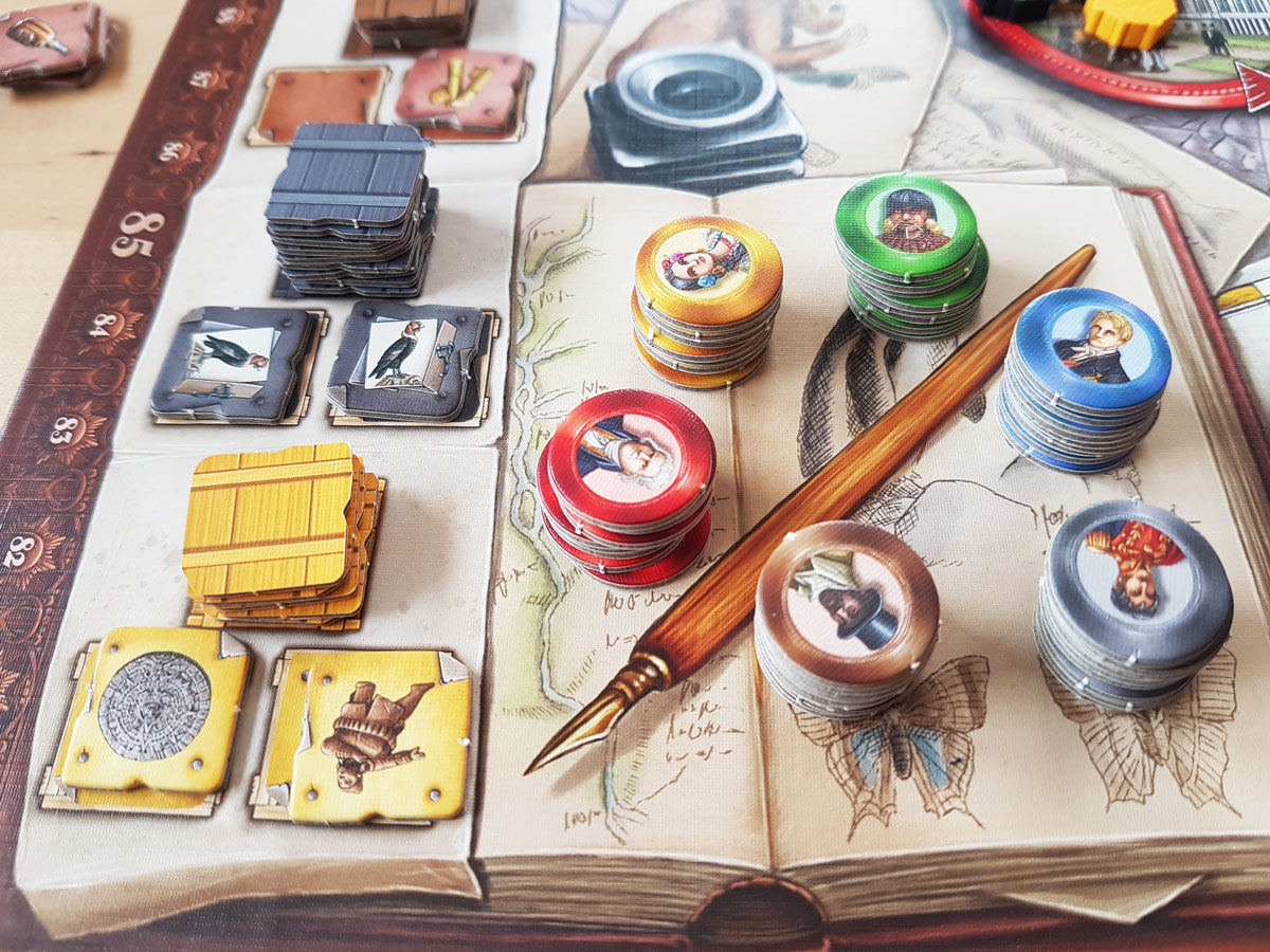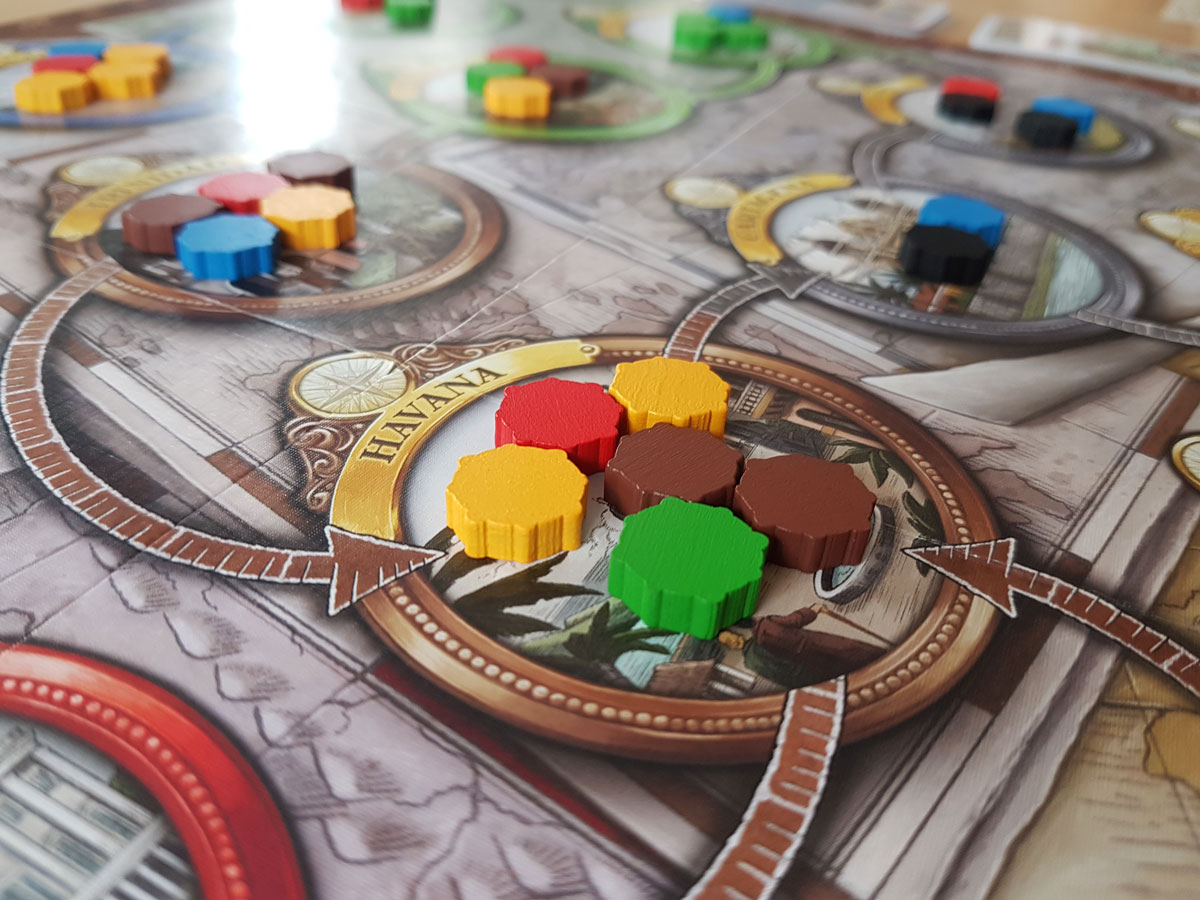 Das geht alles sehr schnell, jeder ist ständig dran und die Downtime ist kaum vorhanden. Denn trotz der vielen Orte habe ich nur zwei oder drei Orte, die ich beachten muss und da die Pfeile die Richtung vorgeben, habe ich da auch kaum Möglichkeiten zu überlegen wie und wo ich hinziehe. So sind die Überlegungen sehr eingeschränkt, was dem Spielverlauf sehr gut tut. Letztlich kommt es darauf an, möglichst viele Schiffe voll zu bekommen und möglichst oft die Zusatzaktionen auszulösen.