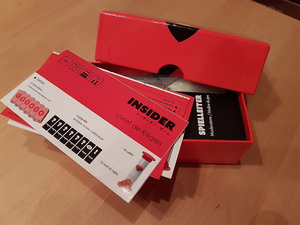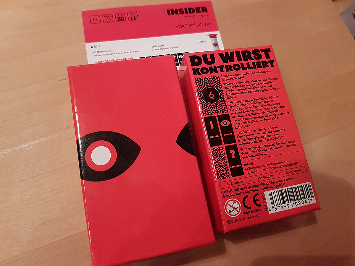 Insider von Kwaji, Daichi Okana, Kito Shinma und Akihiro Itoh für 4 bis 8 Spieler ab 9 Jahren, erschienen bei Oink Games 2016, ist ein Deduktionsspiel mit Ratequiz-Elementen. Während die Spieler einen Begriff erraten, kann der Insider (der den Begriff kennt) mit gezielten Fragen die Gruppe zum richtigen Begriff hinleiten, sollte sich dabei aber nicht als „Insider“ enttarnen. Wenn sich die Gruppe darauf einlassen kann, haben sie hier ein sehr gutes Spiel vor sich, sonst wird es schnell zum Flopp. Also erst ausprobieren.