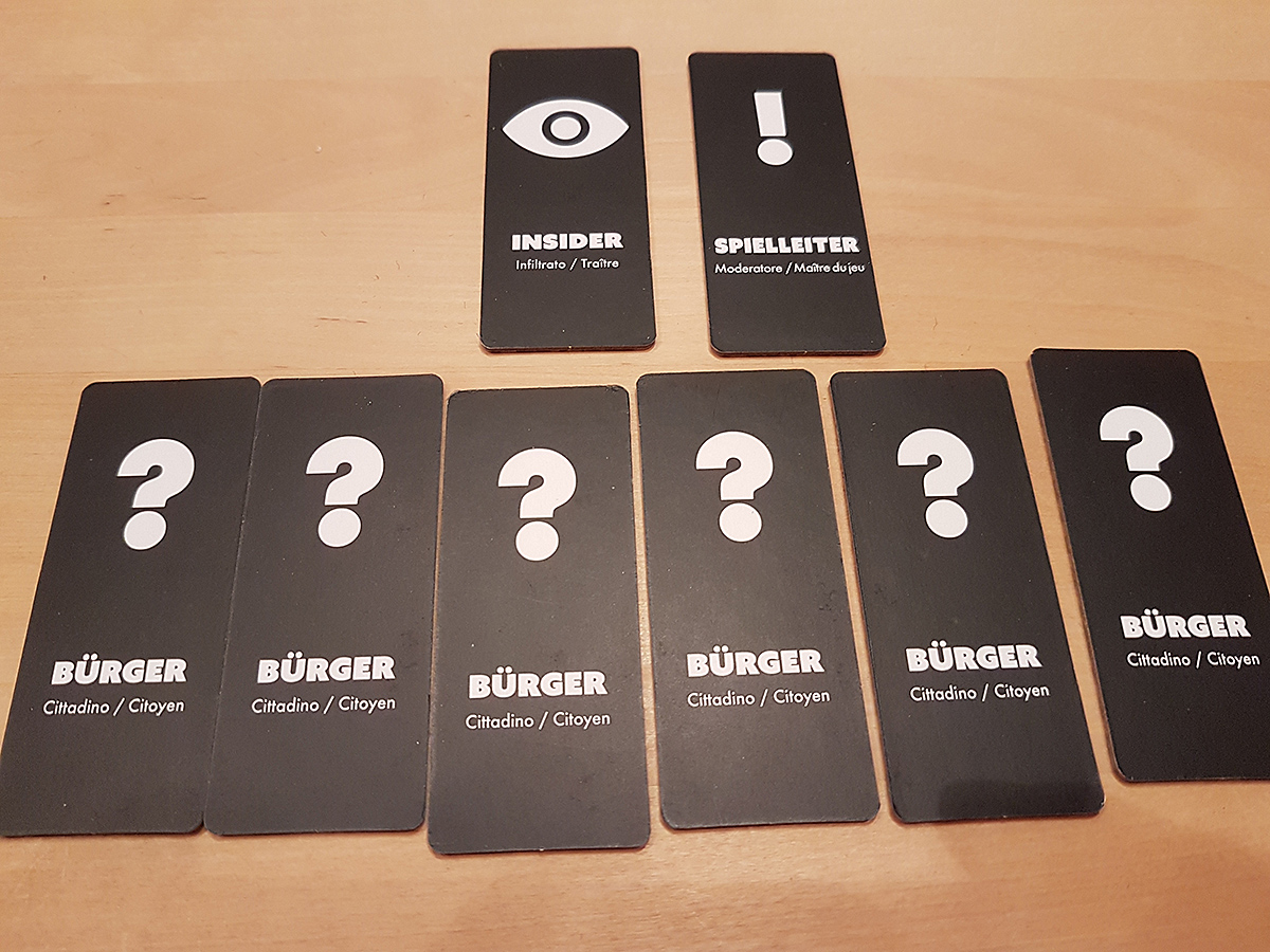 Das kann funktionieren, kann aber auch zu einem reinen Ratespiel werden, wenn es um das Aufdecken des Insiders geht. Denn mit fünf Minuten Zeit errät jede Gruppe den geheimen Begriff. So schwer sind diese nämlich nicht. Und nach wenigen Runden weiß man, welche Standardfragen man stellen muss, um dem Begriff sehr nahe zu kommen. Der Rest ist gezieltes Nachfragen. Der Insider muss sich also gar nicht „richtungsweisend“ beteiligen. Eine unverfängliche Frage eingestreut, um nicht aufzufallen, aber den Rest macht die Gruppe ganz von selbst. In der restlichen Zeit wird dann nur geraten, wer der Insider ist, da sich dieser nicht verraten musste. Keine befriedigende Lösung.