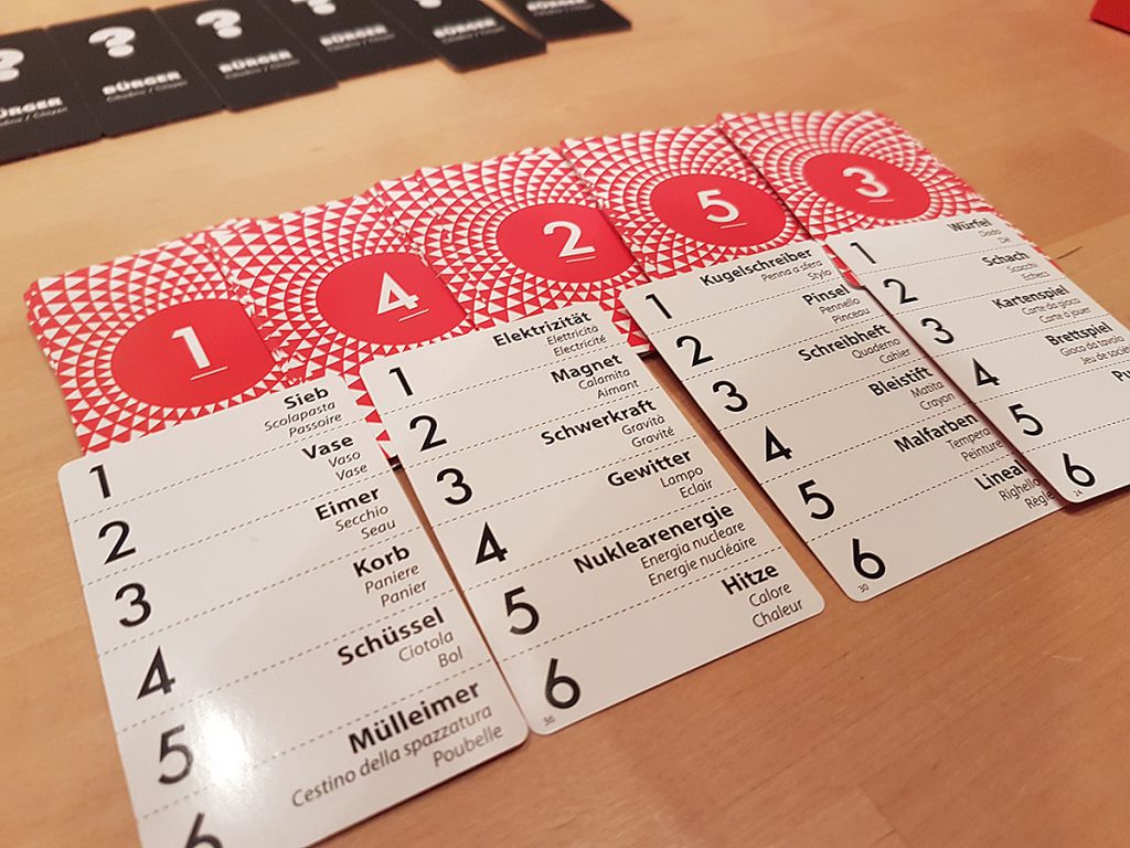 Das Material in der winzigkleinen Schachtel – typisch Oink Games – ist gut, die Begriffe auf den Karten nicht besonders ausgefallen und machen den Quizteil ziemlich einfach.