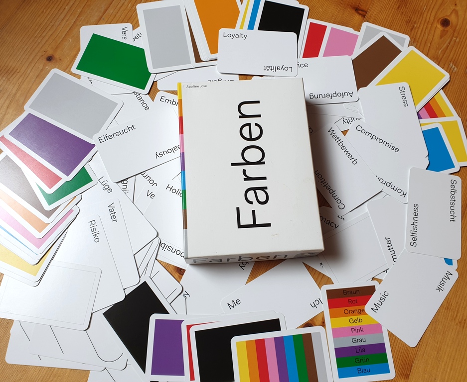 Farben ist nicht nur Titel, sondern auch Inhalt. Denn alle SpielerInnen erhalten ein Set aus verschiedenen Farbkarten auf die Hand. In der Tischmitte liegen 10 zufällig gezogene Wortkarten. Jetzt muss jeder dem aktuellen Wort eine seiner Farbkarten zuordnen und dazu eine Geschichte erzählen. Natürlich mit einer passenden Begründung, warum man nun diese oder jene Farbe gewählt hat. Sind alle 10 Wortkarten mit Farben bestückt , kommt es zur Punkterunde. Jetzt müssen die MitspielerInnen versuchen sich daran zu erinnern, wer welche Farbkarte gewählt hat. Die dazu erzählten Geschichten sollen helfen, sich daran zu erinnern. Je nach Spieleranzahl muss jede Spielerin 2 bis 3 Stapel auflösen. Wem das am Besten gelingt, der gewinnt.